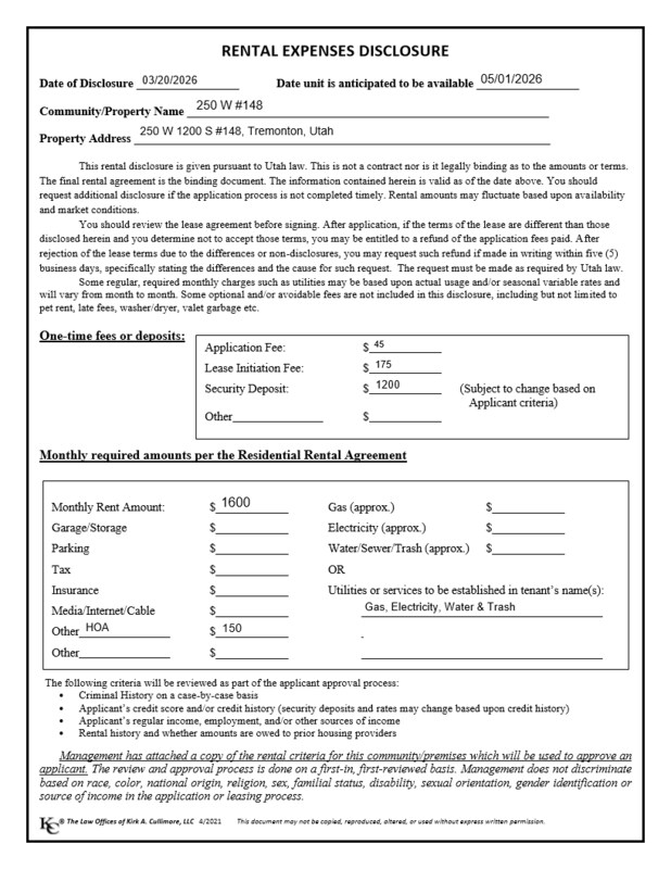 How much is the rent at 250 1200 S?