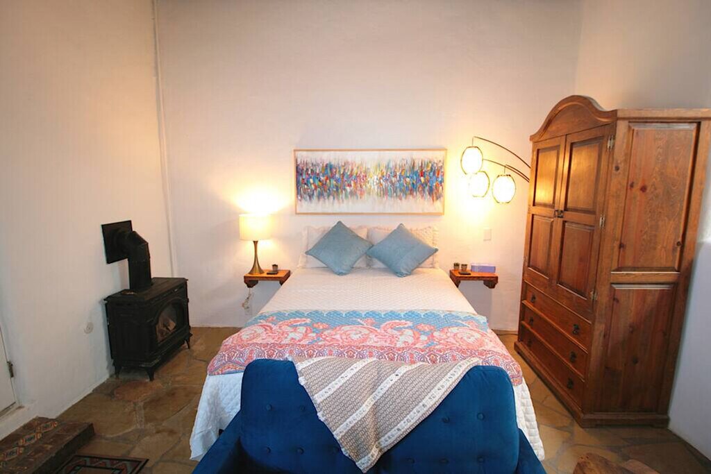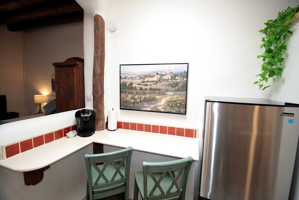 The advertised rate of $1,756/month is the lowest available price, based on a 30 day(s) stay with a move-in date of March 23, 2026. Rates vary depending on the duration of stay, season, and other parameters. For exact pricing and additional pricing components, please visit our website and enter your desired move-in and move-out dates. The rate is applicable when billed upfront; it can be higher if billed in multiple payments. Welcome to your perfect retreat in Santa Fe, a charming casita that beautifully blends historical architecture with modern luxury. This delightful home features flagstone and Saltillo tile flooring, Spanish-inspired tiling, intricately carved wooden cabinetry, a stone-tiled shower, and wooden Vigas throughout, creating an inviting atmosphere for solo travelers or couples. Unwind in the cozy living area, whether in bed or on the loveseat, to read, work, or enjoy a movie. The fully equipped kitchen is ideal for preparing meals at home, complemented by a built-in dining bar for indoor dining. For those who prefer the outdoors, a small private courtyard with seating and a charcoal grill awaits. Baby equipment is available on a first-come, first-served basis for an additional fee. Nestled in the highly desirable Railyard District, this casita places you within walking distance of a variety of shops, restaurants, theaters, and attractions like the local farmer’s market and free concerts. The Santa Fe Plaza, just 0.7 miles away, offers historical and artistic sites, while Canyon Road and Museum Hill provide further cultural exploration. With easy access to public transportation and ride-sharing services, getting around Santa Fe is a breeze. Quiet hours are from 10 PM to 6 AM. Guests are responsible for any damages or excessive cleaning charges. Smoking indoors is prohibited, with a $500 cleaning fee for violations. Pets are not allowed, and a $300 cleaning fee applies if evidence of a pet is found. Parking is limited to one vehicle for this studio, and trailers or RVs are not permitted. Check-in and check-out times are specified in the house manual, with a potential $40/hr fee for unauthorized late check-outs. Reliable high-speed Wi-Fi ensures a seamless remote work-friendly environment, allowing you to stay connected effortlessly. Registration Number: STR227529 [SI]