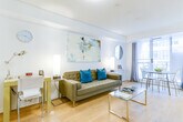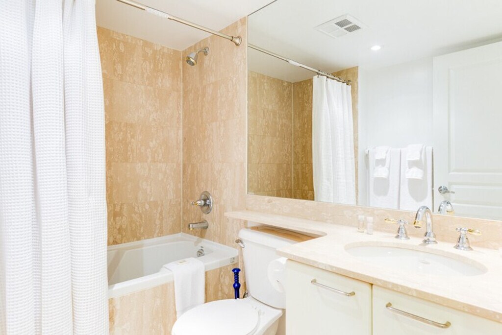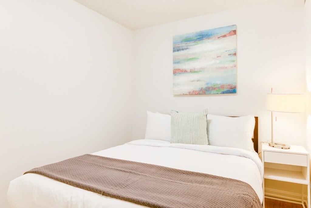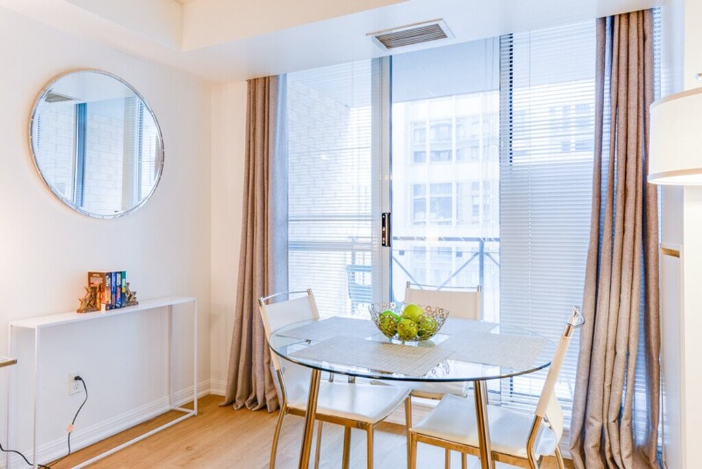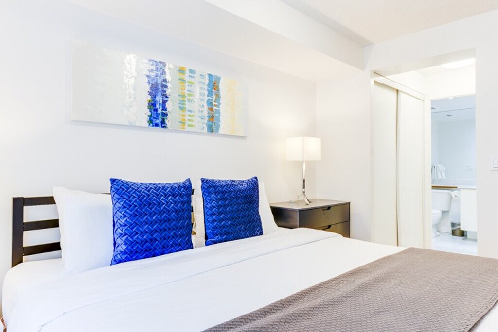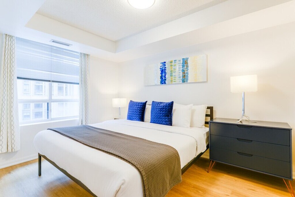 Feel at home in this modern, furnished 2-bedroom and 2-bathroom condominium located just steps from all major downtown Toronto hotspots. With the TTC at your door, this suite offers a king-size bed in the main bedroom and a queen bed in the second bedroom, comfortably sleeping up to four guests. The suite is equipped with a full kitchen and in-suite laundry, ensuring convenience and comfort for a minimum stay of 30 days. This apartment boasts a prime downtown location, just steps away from the Financial and Entertainment districts, shopping, and restaurants, and is conveniently located across the street from the subway. The suite is meticulously cleaned, with high-touch surfaces sanitized and cleaners and disinfectants approved by global health agencies used throughout. Extra cleaning supplies are provided for your convenience. Parking is not included. Please reach out for availability and rates. Interim housekeeping services are also not included but can be arranged upon request for an additional fee. A starter kit with essentials such as soap, shampoo, dishwasher and laundry pods, toilet paper, and paper towels is provided to help you settle in, with replenishment as needed. Located in the heart of downtown Toronto, this apartment offers unparalleled access to the city's vibrant Financial and Entertainment districts. With shopping, dining, and the subway just steps away, you'll have everything you need right at your doorstep. The apartment features a 24/7 staffed security desk for your peace of mind. Note that there is a no parties and no smoking policy in place.