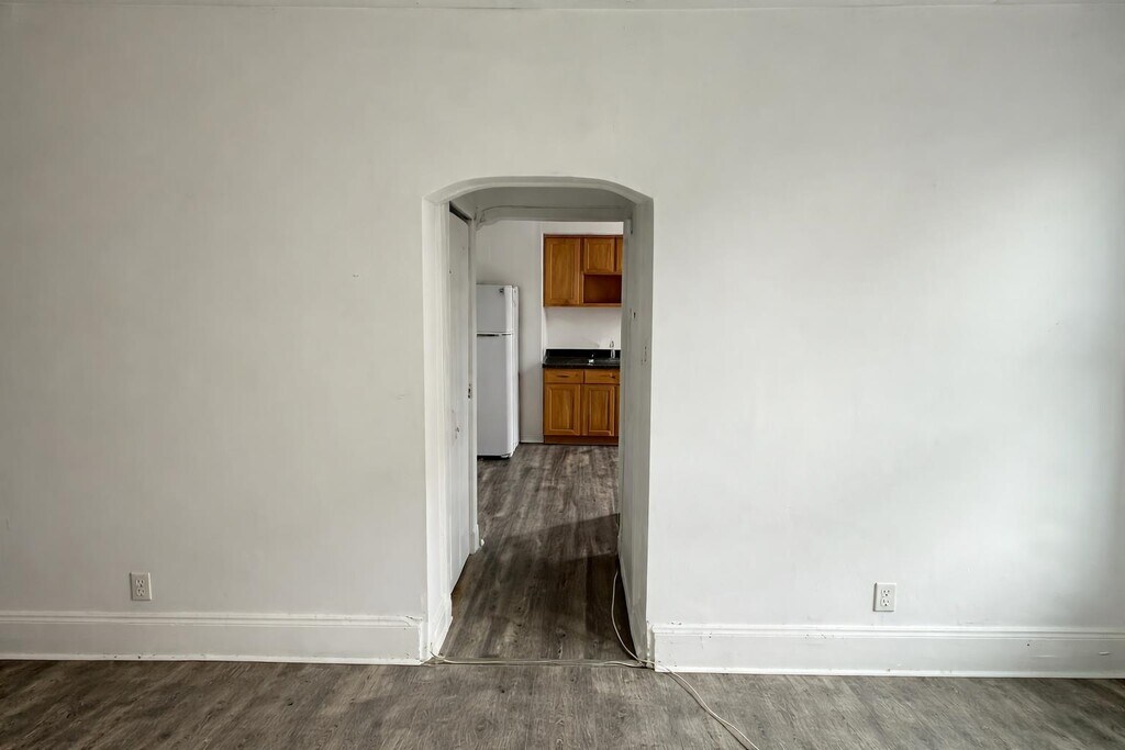 A separate eat-in kitchen features warm wood cabinetry, a gas stove, and plenty of counter space for meal preparation. The adjacent window invites natural light and overlooks the quiet residential street, making cooking a pleasant experience. Enjoy a generously sized bedroom with enough room for a queen-sized bed and additional furniture. The large windows and radiator heat keep the space cozy year-round. The bathroom is well-maintained with a tiled shower, modern fixtures, and its own window for ventilation and natural light. Situated on a charming block of 25th Street, this apartment offers quick access to NJ Transit buses and routes to Manhattan, Hoboken, and Jersey City. Local shops, markets, and dining options are just a few minutes away, along with nearby parks and schools. Street parking is available, and being on the first floor adds to the convenience. This unit is ideal for singles or couples seeking an affordable, comfortable home with good proximity to public transportation and everyday amenities.