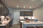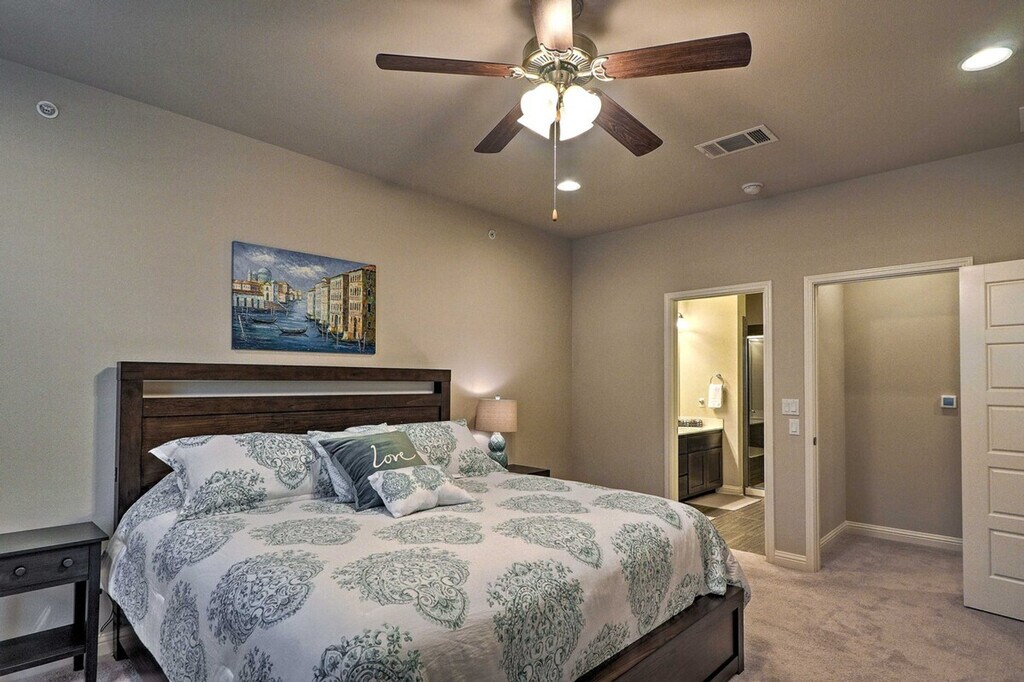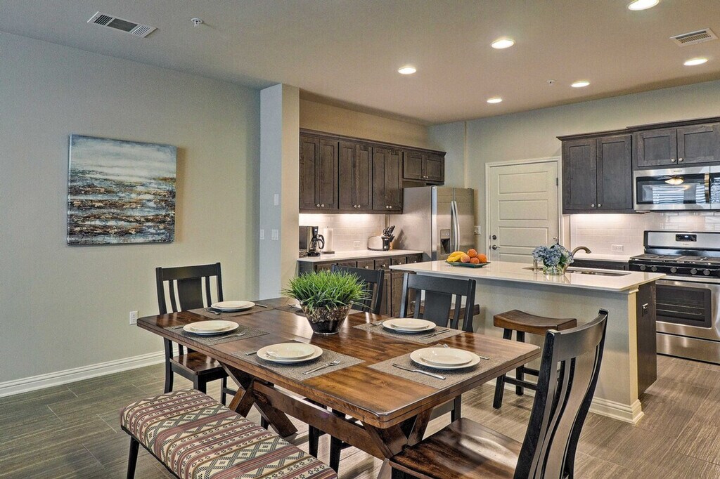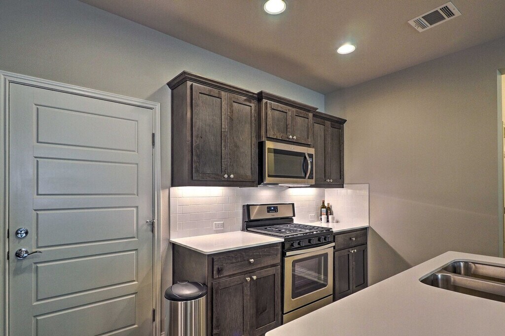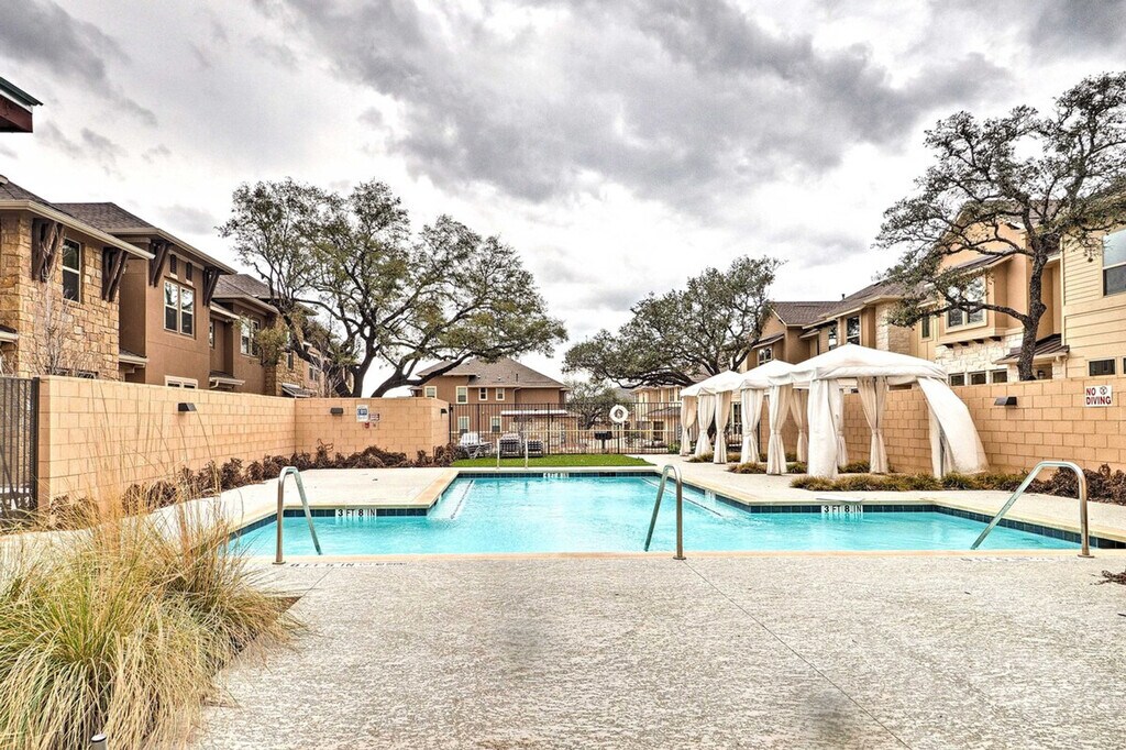 Feel at home in this beautiful 2-bedroom, 2-bathroom townhouse, located 18 miles from downtown Austin. Note that access to the home requires stairs. This spacious 1,659-square-foot property boasts an open-concept living room with 9-foot tall ceilings, a sitting room, and a fully equipped gourmet kitchen. The kitchen is outfitted with stainless steel appliances, a double-door fridge, brand new cabinetry, and a 2-person breakfast bar. You'll also find in-unit laundry machines with laundry detergent and free Wi-Fi. Relax in the open-concept living room with grey-colored tiles designed like wood grain, sink into the comfortable L-shaped couch, and watch shows on the flat-screen cable TV. Each of the 2 bedrooms boasts a cloud-like king or queen mattress with silky-smooth sheets and an en-suite bathroom. Enjoy access to community amenities including charcoal grills and a pool with 3 cabanas. Two-car garage parking is available. Nestled in the beautifully landscaped and gated Lakeline Center, this townhouse is within walking distance of the Lakeline Trail, Target, and the Lakeline Center. It is also close to a variety of local restaurants and public transportation. Downtown Austin is 18 miles away, and Lake Travis is a 22-minute drive. Enjoy the gorgeous layout of this gated community and the foliage-filled courtyard. No pets are allowed. No events, parties, or large gatherings are permitted. This property features an exterior security camera; it does not look into any interior space. [SI]