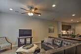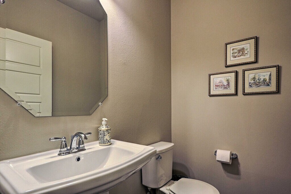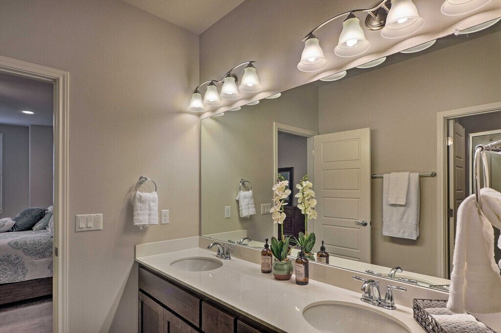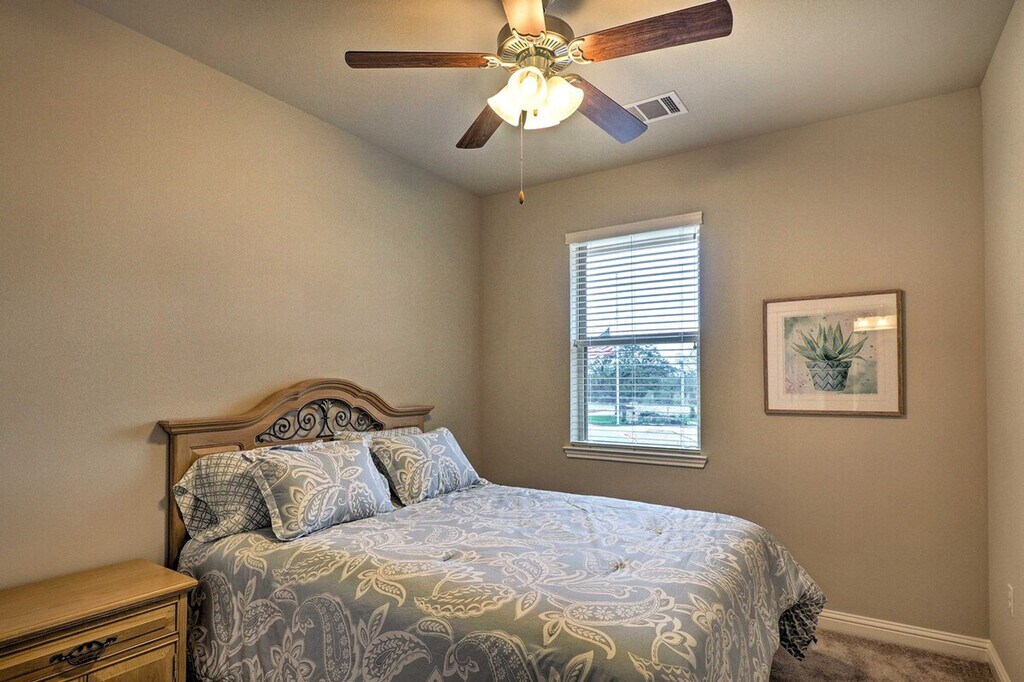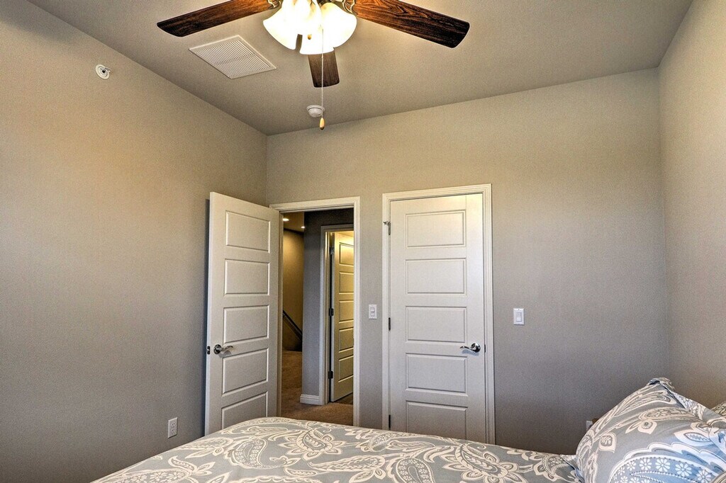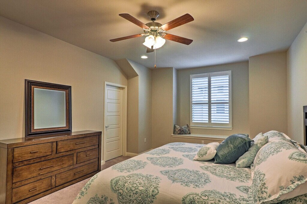 Feel at home in this beautiful 2-bedroom, 2-bathroom townhouse, located 18 miles from downtown Austin. Note that access to the home requires stairs. This spacious 1,659-square-foot property boasts an open-concept living room with 9-foot tall ceilings, a sitting room, and a fully equipped gourmet kitchen. The kitchen is outfitted with stainless steel appliances, a double-door fridge, brand new cabinetry, and a 2-person breakfast bar. You'll also find in-unit laundry machines with laundry detergent and free Wi-Fi. Relax in the open-concept living room with grey-colored tiles designed like wood grain, sink into the comfortable L-shaped couch, and watch shows on the flat-screen cable TV. Each of the 2 bedrooms boasts a cloud-like king or queen mattress with silky-smooth sheets and an en-suite bathroom. Enjoy access to community amenities including charcoal grills and a pool with 3 cabanas. Two-car garage parking is available. Nestled in the beautifully landscaped and gated Lakeline Center, this townhouse is within walking distance of the Lakeline Trail, Target, and the Lakeline Center. It is also close to a variety of local restaurants and public transportation. Downtown Austin is 18 miles away, and Lake Travis is a 22-minute drive. Enjoy the gorgeous layout of this gated community and the foliage-filled courtyard. No pets are allowed. No events, parties, or large gatherings are permitted. This property features an exterior security camera; it does not look into any interior space. [SI]