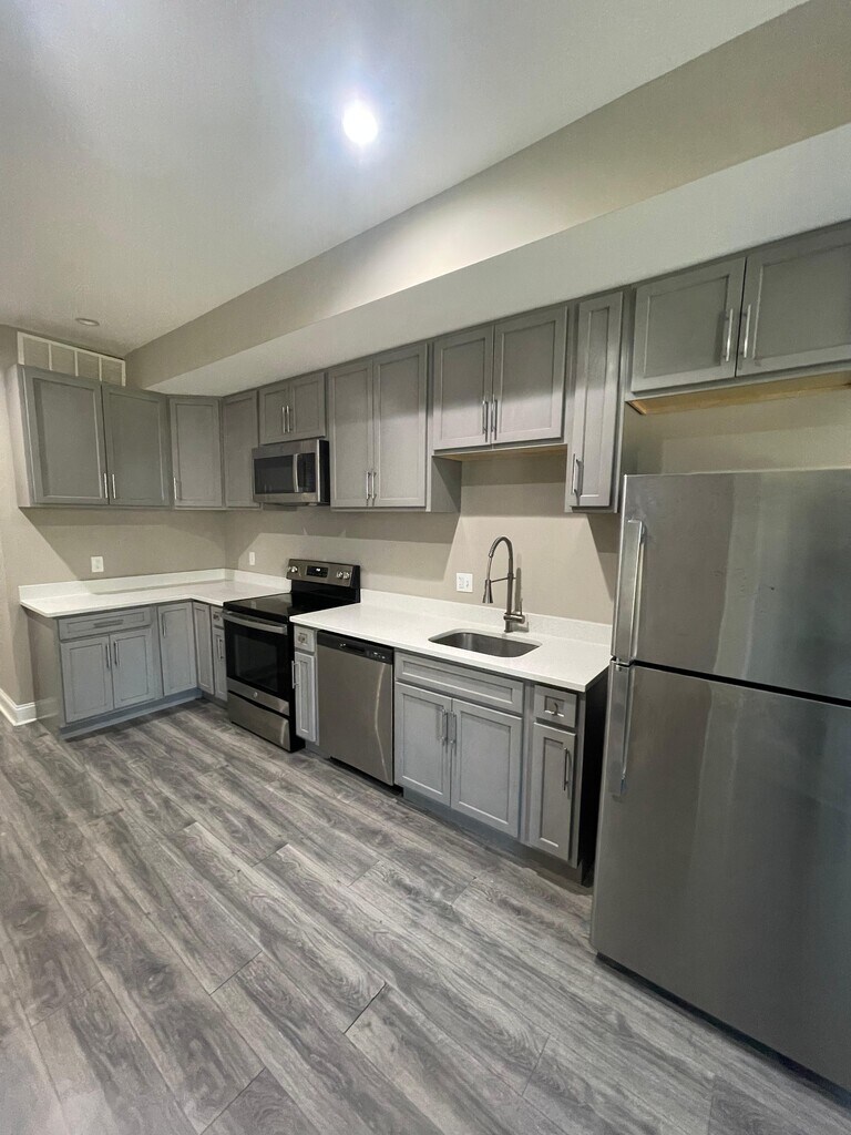 This rent-ready apartment features laminate flooring, stainless steel appliances including a dishwasher, modern gray cabinetry, and crisp white countertops.
