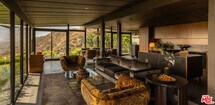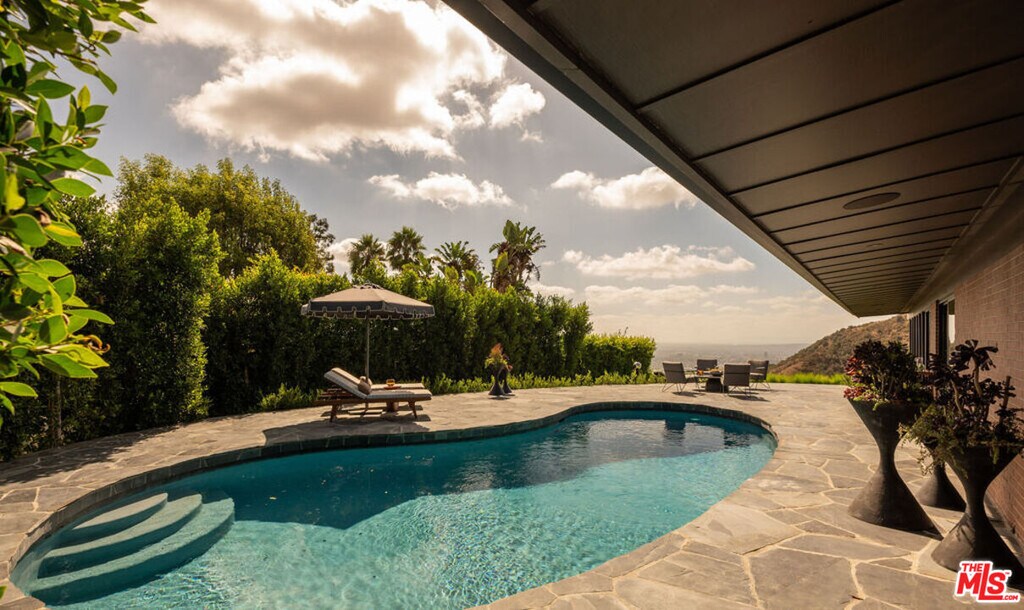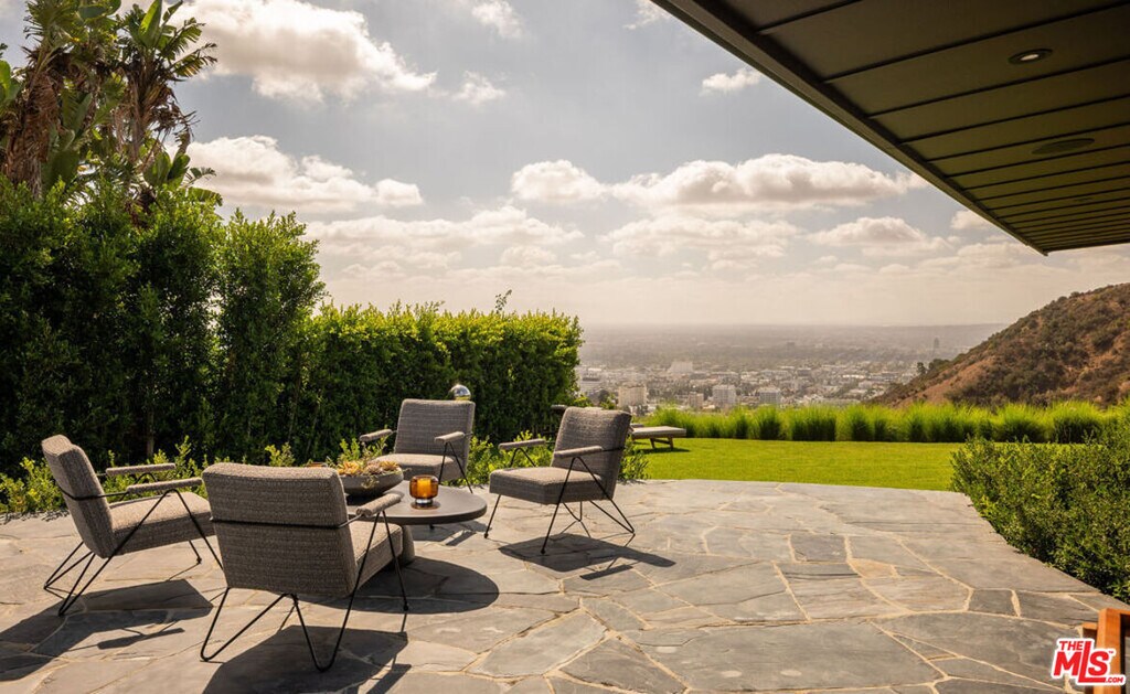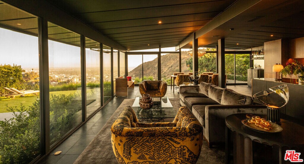 Poised within a sanctuary of architectural beauty and raw natural landscape, this mid-century masterpiece has been reborn--an expression of quiet power, precision, and timeless seduction. Every line refined. Every material intentional. Floor-to-ceiling glass dissolves boundaries between interior and exterior, framing the city skyline like a living work of art. Light moves through the space like liquid, illuminating sculpted forms and impeccable craftsmanship. A complete reinvention from the ground up by Studio Veren: new roof, all new windows, slate floors, Miele appliances, and custom walnut cabinetry throughout. The exterior, once cinderblock, is now fully wrapped in brick--an elegant armor that speaks to permanence and design discipline. Outdoors, flagstone terraces unfold into a private, landscaped retreat. A custom dining banquette captures 360-degree views; a setting that feels cinematic at sunset. Inside, custom furnishings are handcrafted for each room, draped in fabrics from Dedar, Schumacher, Perennials, and Pierre Frey. Vintage lighting and curated accessories punctuate the modern calm with soul and sophistication. Two car garage with Tesla charger. MLS# 25607161