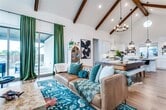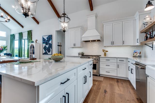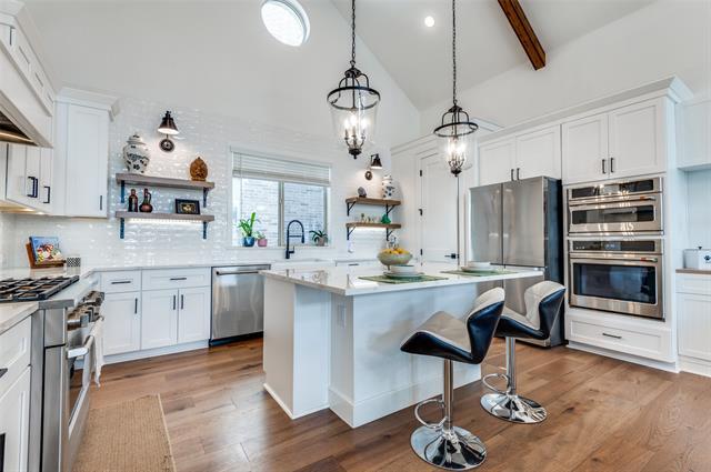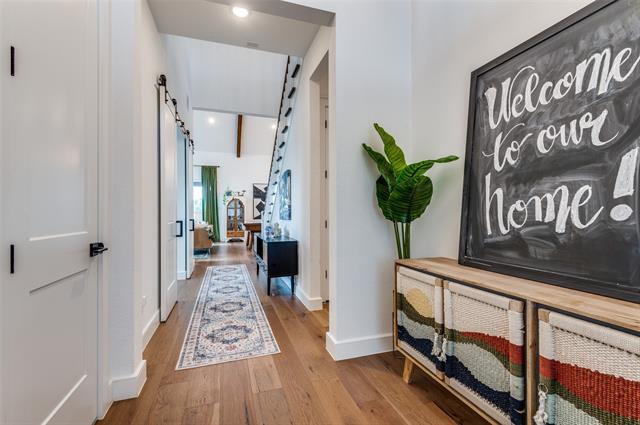 Discover refined elegance in this modern farmhouse built by K Hovnanian Homes! Pride of ownership shines throughout this home as it was thoughtfully designed and curated. This 5-bed, 4.5 bath sits on a large corner lot with beautiful green spaces right across! From the moment you enter, you’re greeted with a dramatic 2-story high foyer that sets the tone for the home’s exceptional scale and beauty. With wide plank wood flooring and 18-foot vaulted ceilings with cedar beams spanning across the kitchen, dining, and living room, this home has an abundance of natural light streaming through all windows, bathing the home with sunlight! The impressive backyard includes the 12-foot 3 panel sliding glass door making it easy to host family gatherings & celebrations. The bright kitchen features upgraded GE Café appliances, a dual oven, hybrid microwave, beautiful Calcattta Oro Quartz countertops a white farmhouse sink and all the storage you need. The master includes a full closet system and a spa-inspired bathroom with an oversized wet-room which includes a rainfall shower and large free standing soaking tub. Conveniently located on the 1st level is an oversized guest-generational bedroom with en-suite bath and a private office with modern barn doors. So many features including a 3-car tandem garage with built-in overhead storage, Wi-Fi enabled garage door opener and laundry room with cabinetry and closet space for all your holiday décor! Upstairs, the home continues to impress with 3 oversized bedrooms, and a game room that provides endless opportunities for family fun. Cat5 (internet) ports are conveniently located throughout the home to make home automation integration effortless. Lewisville ISD schools with Hebron High School located right across the street, minutes away from Willow Bend Mall, shopping dining, Hwy 121 and DNT.