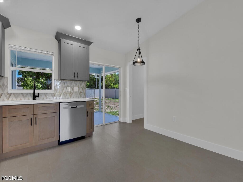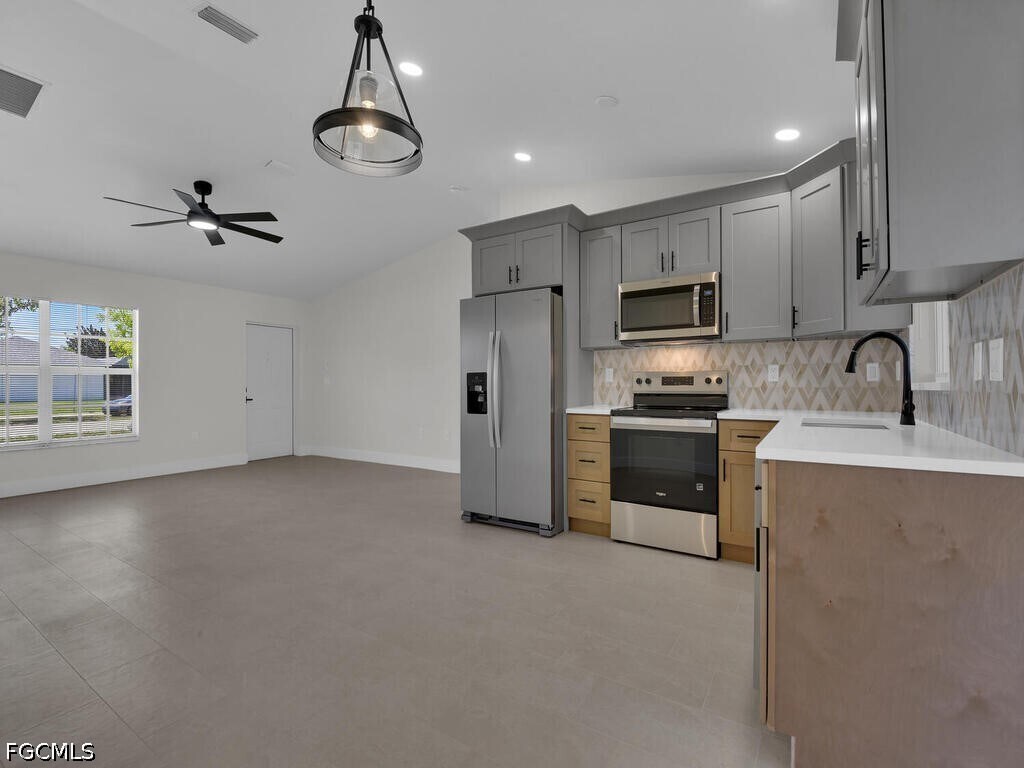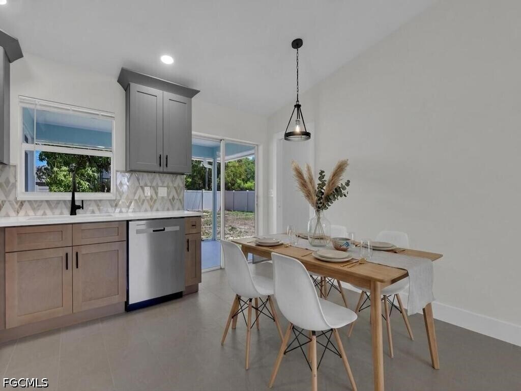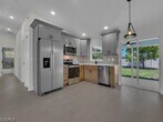 Available now in the desirable central Cape Coral area,this beautifully updated 3-bedroom,2-bath home with an extended 2-car garage offers modern finishes and comfortable living throughout. The home features 18” porcelain tile flooring,volume ceilings,fresh interior paint,and elegant 5” baseboards. The fully renovated kitchen showcases natural wood lower cabinets,gray upper cabinets,a quartz waterfall-edge countertop,and brand-new stainless steel appliances. Enjoy peace of mind with a new air conditioning system and water heater. The spacious primary suite includes dual sinks and a luxurious marble walk-in shower with a glass enclosure,creating a spa-like retreat. Step outside to a large screened lanai—perfect for relaxing or entertaining—overlooking a fully fenced yard for added privacy. The property is connected to city water and sewer. Lawn care is included in the rent. Pets are welcome with owner approval and a deposit.