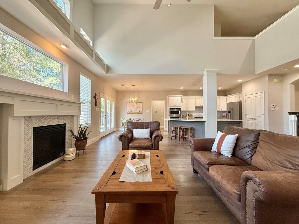 Stunningly remodeled home on a large,wooded lot in Alden Bridge! Close to Alden Bridge Shopping Center,walking trails,parks and exemplary schools! Covered front porch,fresh neutral interior paint,vinyl plank flooring,designer light fixtures,quartz counters in kitchen and baths,& much more! The study is at the front of the home and can be closed off with French doors for privacy; formal dining & living areas open to one another; the two story den with gas log fireplace overlooks the remodeled kitchen with stainless steel appliances,convection microwave,gas cooking,new cabinetry and beautiful backsplash. Spacious owner's retreat down offers a sitting area,gorgeous remodeled bath with free standing tub & huge shower,and walk-in closet. Upstairs you'll find 3 bedrooms,2 full baths,a game room and a bonus room for storage or flex space. Fenced yard with patio surrounded by shade trees. THIS HOME IS AVAILABLE UNFURNISHED OR AS A FULLY FURNISHED PROPERTY. ASK AGENT FOR DETAILS. MLS# 68093933