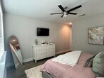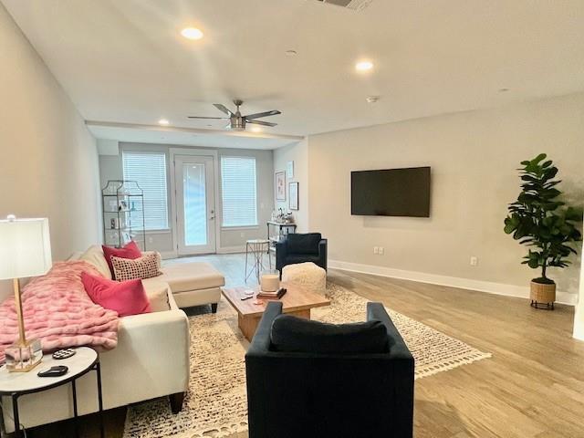 Privately owned and operated, non-corporate. Downtown Living in Old Town Lewisville! Just a few minutes walking distance to shops, dog park, restaurants, coffee and wine shops including a distillery you can explore. Enjoy an abundance of light throughout this high quality 2 bed, 2 bath, 2nd level condo with an open floor plan, high ceilings, beautiful hardwoods in kitchen and living, designer hardware and lighting. Refrigerator, Washer, and Dryer included inside unit. Kitchen showcases a clean modern design with stainless steel appliances, granite countertops and oversized island. Private master with large ensuite bath includes garden tub, oversized shower with rainfall nozzle and walk in closet with organizational features. Perfect for entertaining, you will enjoy the spacious living area and the 15 x 8 balcony. The home has light neutral colors with great natural light from the front and back of the unit.
