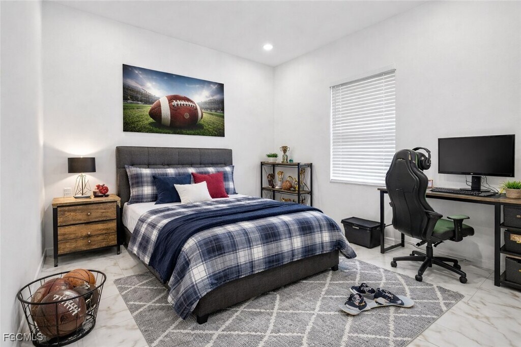 Welcome to this beautifully designed newer construction home situated on a spacious corner lot in Lehigh Acres. This 4-bedroom,3-bath residence offers a bright,open-concept layout with high ceilings and clean tile flooring throughout,creating a warm and welcoming atmosphere. The kitchen serves as the heart of the home,featuring white shaker cabinetry,quartz countertops,stainless steel appliances,and a large island perfect for everyday living and entertaining. A thoughtful split-bedroom floor plan includes a private primary suite and a junior en-suite,ideal for guests or flexible living arrangements. Enjoy the covered rear patio for quiet mornings or evening unwinding. Attached 2-car garage,concrete driveway,and low-maintenance landscaping complete the package. Conveniently located near major roads,shopping,dining,and schools. No HOA.