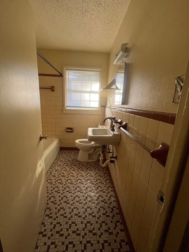Tile bathroom with ceramic tub/shower, linen closet in bathroom, fenced yard, Living/dining room, back open patio, storage room off back of house.