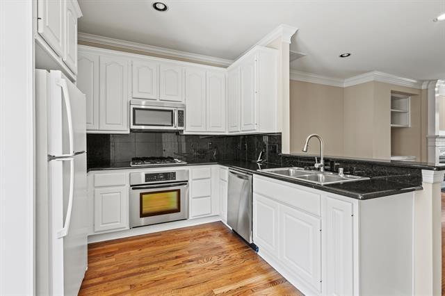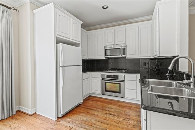 Located in the highly sought-after State Thomas Historic District of Uptown, this beautifully appointed townhome offers a rare combination of charm, convenience, and modern updates. Nestled on one of the quietest streets in the neighborhood, the home overlooks a lush garden courtyard filled with mature trees, flowers, and birds, creating a peaceful retreat in the middle of the city. The first floor features a private bedroom with en suite bath, ideal for guests or a roommate. The open second floor includes the main living area with hardwood floors, crown molding, abundant natural light, a half bath, and a kitchen with granite counters, stainless steel appliances, gas cooktop, and breakfast bar. The third floor is dedicated to the spacious primary suite with en suite bath, generous closet space, and an adjoining office with balcony overlooking the garden courtyard. Recent updates include fiber internet, new water heater, dishwasher, disposal, paint, carpet, hardwood stairs, and more. Refrigerator, washer, and dryer convey. Attached two-car garage plus six free guest spaces and parking directly behind the garage. Low $150 month HOA covers exterior and landscaping. All within walking distance to coffee shops, Whole Foods, Griggs Park, and just minutes to the Katy Trail. Don't miss your chance to schedule your showing today!