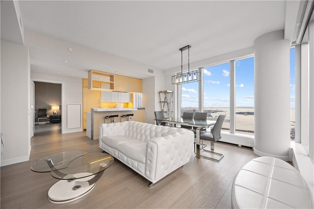Furnished Unit. Residence 52L is a 1,123 square foot two-bedroom, two-bathroom with an open gourmet kitchen and breakfast bar. This spacious corner unit faces Southeast and Southwest, with expansive City and Harbor views. Warm, modern interiors are brought to life by the renowned design team at Meyer Davis Studio. This residence features imported stone and custom finishes, a premium Miele appliance package, 5 wide stained oak flooring, master bath with custom wood cabinetry, marble tile walls and mosaic floors with radiant heat, under-mount Wetstyle sink with glass vanity top and Dornbracht polished chrome faucets and a washer and dryer. Building is conveniently located near F train subway, with a private shuttle to Fulton Street and Union Square. Building amenities are swimming pool, Hot tub, Sauna, Squash court, Golf simulator, Full indoor basketball court, 43 seats movie theatre and more. Cost and Fees: $20 rentspree background check $500 application fee $150 credit check fee per applicant $1,000 Move-In/Move-Out Fees (non-refundable): $500 each Replacement Fees: $10 for mailbox keys, $20 for apartment keys $25 for access cards.