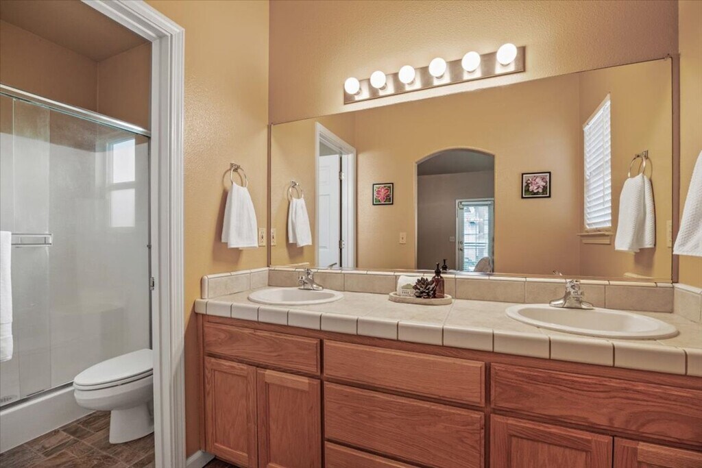 Welcome to this beautiful 3 bedroom, 2 bathroom home, nestled in a tranquil and sought-after neighborhood. This spacious property boasts a host of desirable features, making it the perfect place for you to call home. As you enter this stylish and inviting home, you'll immediately notice the open floor plan, perfect for entertaining guests or enjoying quality time with family. The modern kitchen comes complete with appliances, tile countertops, and ample cabinet space, making meal prep a breeze. The luxurious master suite serves as a private retreat, with direct access to the stunning backyard, allowing you to enjoy your morning coffee or unwind in the evenings amidst a serene outdoor setting. The recently remodeled backyard features a charming arbor, creating a magical atmosphere for alfresco dining, summer barbecues, or simply enjoying the outdoors with loved ones. The two additional bedrooms are generously sized and feature walk-in closets, offering plenty of storage for all your belongings. The attached 2-car garage provides secure parking and additional storage, while the hard surface floors in the common areas offer both beauty and practicality. This charming 3 bed, 2 bath home is ready for you to move in and start making memories. With its combination of luxury, comfort, and style, this property won't be available for long. Don't miss this opportunity to lease your dream home!