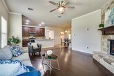 Beautiful One-Story overlooking the Golf Course in the Golf Community of Stone River Estates! Stone and Brick Exterior and Landscaped to Perfection. Fabulous Floor Plan featuring all wood and tile flooring 3 Bedrooms ,2 Full Baths, a Handsome Study, Elegant Formal Dining Room, Island Kitchen with Granite Counters and SS Appliances, Breakfast Area and Spacious Living Rm with Wood Burning Fireplace with Floor to Ceiling Stone. Utility Room with Drip Dry area, Cubbies for Storage, room for a Freezer. Large Master Suite and Bath with Oversized Shower and Dual Sinks. Faux Wood Blinds. Relax on the Covered Patio with Views of the Golf Course!