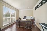 The entryway opens to an open foyer and feature wrought iron ornate spindles and wood handrail that follow the curved staircase to the second floor. Off the foyer is an office/den space behind French doors with natural light from two large windows. Across the hall is the formal dining room with natural lookin hardwood floors. The hall,living room,and kitchen feature large tile flooring with an elegant ceiling fan and fireplace in the living room,which is open the kitchen. In the kitchen there is an island for extra prep and storage space,along with a gas cooktop,oven,and microwave. Between the kitchen and formal dining room is a dry bar with walk-in pantry and extra storage. The main bedroom is on the first floor and has ample light from four floor to ceiling windows. The main bathroom has two walk-in closets,sunken tub,two separate vanities,and glass door shower. Upstairs are 3 bedrooms and 2 baths,on of which is jack-and-jill style with private sinks for 2 of the bedrooms. MLS# 963690