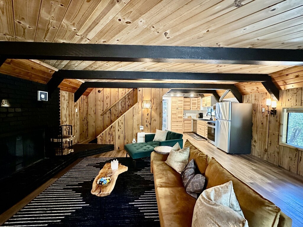 Welcome home to this modified A-frame mountain cabin. As you enter from the front deck the open concept living draws you in. The living room centers on the black brick fireplace. The dining leads to the kitchen with all new appliances. These include fridge, dishwasher, range and microwave hood. Ample cabinet space fills the kitchen as well as the under stairs pantry. The master bedroom is found off the kitchen with full bathroom, Laundry and access to the back deck that overlooks the yard. 2 storage sheds can be found in the back which will both be included if the place is left furnished. Otherwise tenant will have access to one shed and the furniture will be stored in the other. Upstairs is the 2nd master with attached 3/4 bathroom, and access to the 3rd bedroom. Off to the right of the house is ample parking large enough for an RV or Bus. To the left of the house is an additional deck and fruit trees. Peekaboo views can be seen off the back deck. Application needed to show. Tenant responsible for all utilities. Minimum Credit requirement of 650 Minimum Income Requirement of 2.5 x rent.