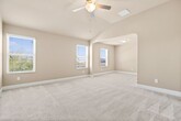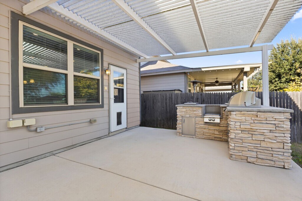 Spacious and move-in ready, this 3 bedroom, 2.5 bath two-story home in Champions Park offers fresh paint, ceramic tile, and crown molding throughout the first floor. A bright formal dining room sits just off the entry, while the living room features generous windows, a ceiling fan, and a cozy nook ideal for a small office or study space. The kitchen is designed for everyday cooking and entertaining with a granite-topped island, farmhouse sink, ample custom cabinetry, great lighting, and a large pantry. Upstairs, a roomy game room provides the perfect spot for family nights. The oversized primary suite includes high ceilings, a sitting area that can double as an office or lounge, and a bath with dual vanities, a garden tub, separate shower, and a walk-in closet. Step outside to a backyard built for relaxing and entertaining with an automated pergola, outdoor kitchen, and privacy fence. Neighborhood amenities include a community pool and playground, with convenient access to Lackland AFB, Northwest Vista, shopping, and restaurants.