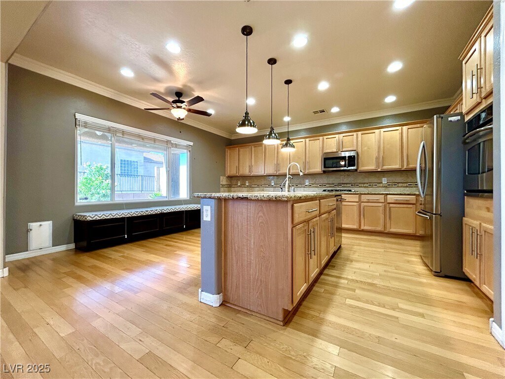 Beautifully designed open-concept home loaded with upgrades! The gourmet kitchen features granite countertops, stainless steel appliances, and elegant wood flooring. Enjoy a spacious 3-car tandem garage with epoxy floors and abundant storage. The open and airy formal living room flows into a separate family room with built-in shelving. Upstairs, a cozy reading loft with built-in shelves and a den with French doors provide flexible living spaces. The primary suite includes an expansive walk-in closet, double sinks, and a separate tub and shower. Two additional bedrooms complete the upper level. This home also features a full home water softener, security system and solar panels for tremendous savings on your power bill. Tenants will need to have internet to utilize security/garage remote app. Pets: 1–2 small dogs (under 35 lbs at maturity) or 1 cat considered with additional deposits and pet rent.