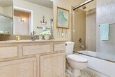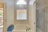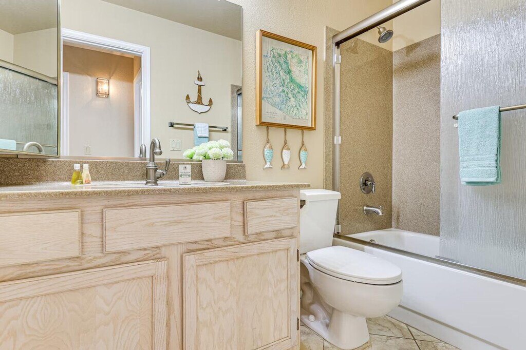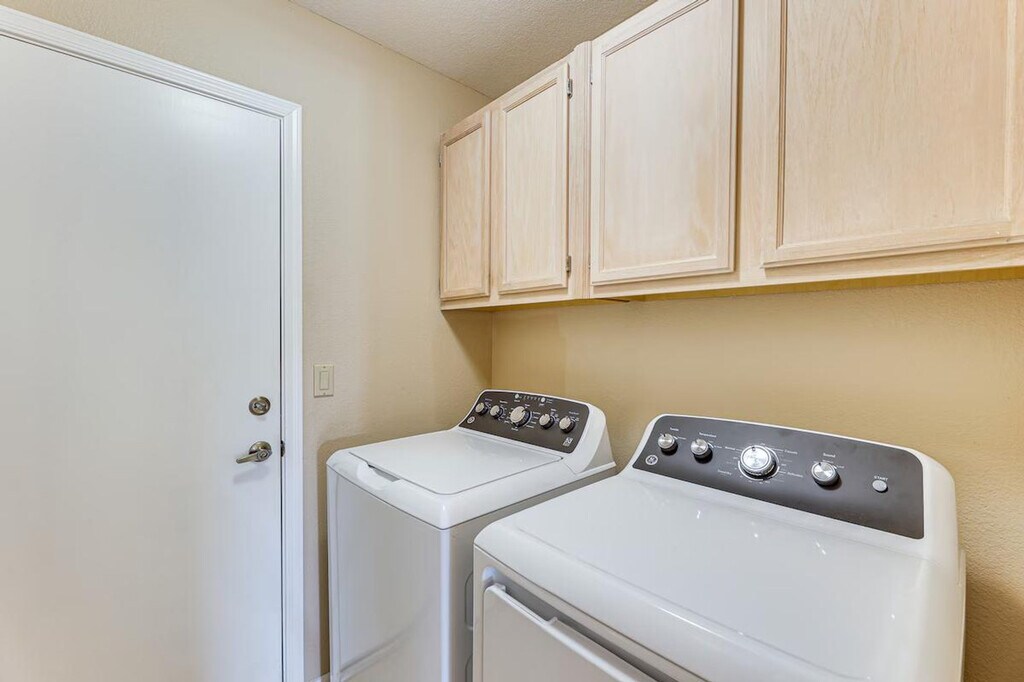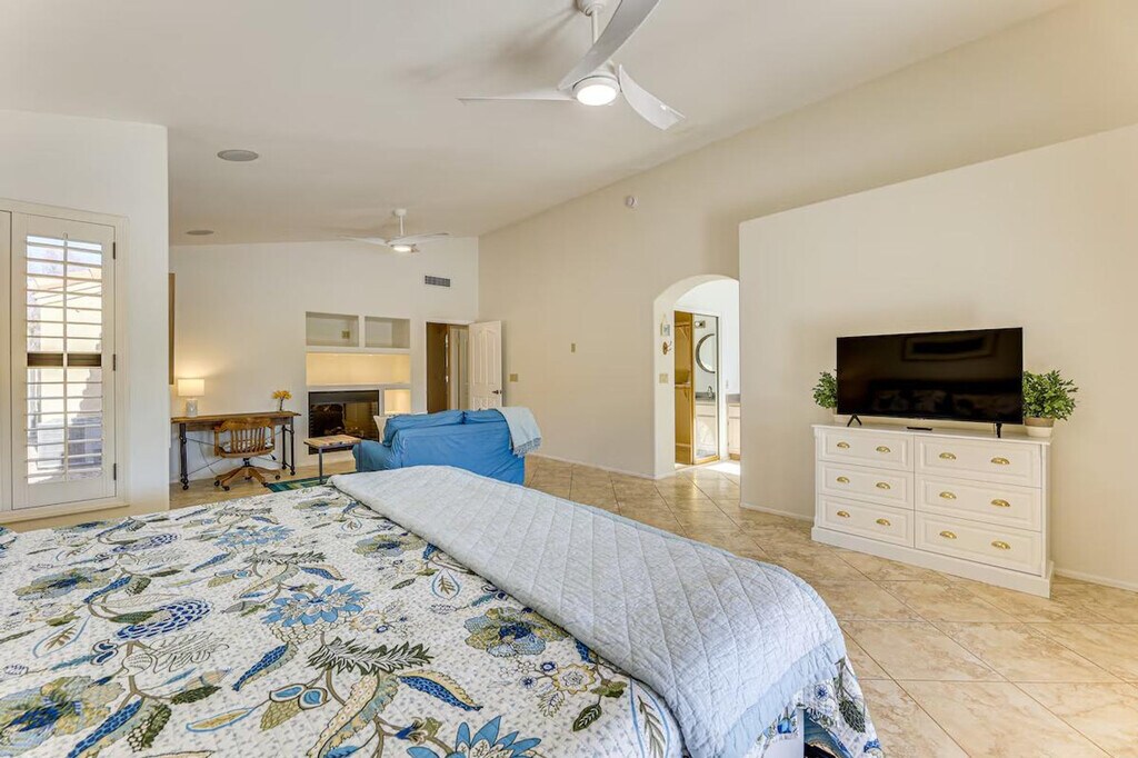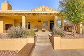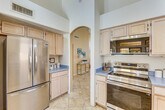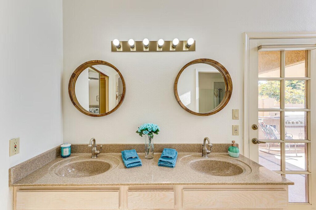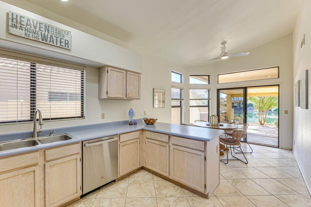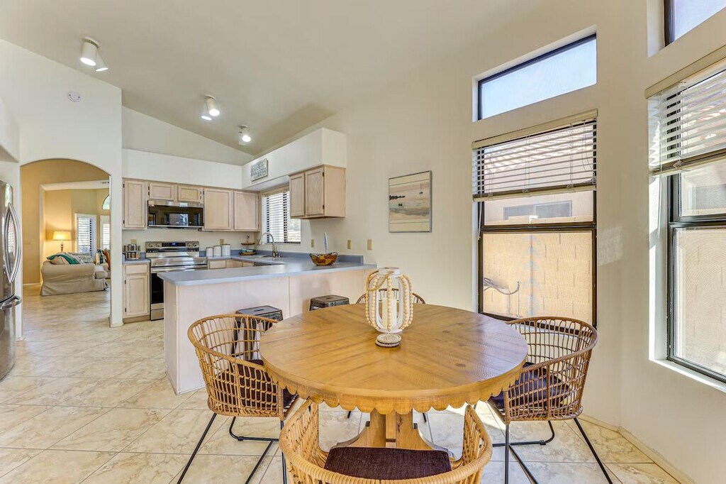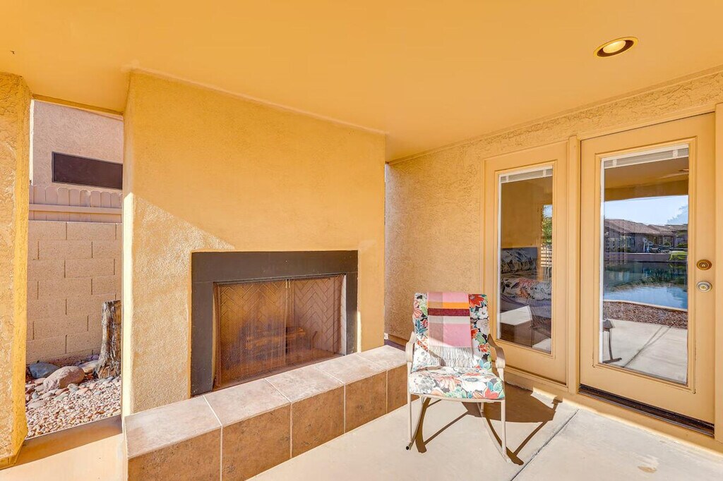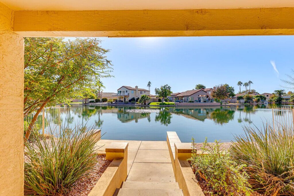 Experience the best of Gilbert, Arizona, during an extended stay at this 2-bedroom, 2-bath vacation rental where you'll feel at home. This single-story home requires one step to enter, and steps are required to access the lake from the patio. This home is in the Stone Bridge community, offering access to a heated community pool, hot tub, playground, lake, and walking trails. The kitchen is equipped with a stove/oven, refrigerator, microwave, dishwasher, drip coffee maker with a starter pack of coffee provided, and toaster, as well as cooking basics, trash bags/paper towels, and dishware and flatware. Enjoy the smart TV, gas fireplace, and dining table indoors, or relax on the patio with a wood-burning fireplace with wood provided and an outdoor kitchen with a gas grill. There are also 2 paddleboards available for your enjoyment. Additional amenities include central heating and A/C, a washer/dryer with a starter pack of laundry detergent, an iron and board, linens and towels, complimentary toiletries, a hair dryer, and keyless entry. Pets are welcome with a $50 fee, plus fees and taxes. This home offers a prime location with easy access to the Heritage District, Western Canal, and Sun Circle Bike Trail. When you're not relaxing poolside, grab a bite to eat downtown or take a day trip to Phoenix! Smoking, events, parties, and large gatherings are prohibited. Additional fees and taxes may apply, and a photo ID may be required upon check-in. [SI]