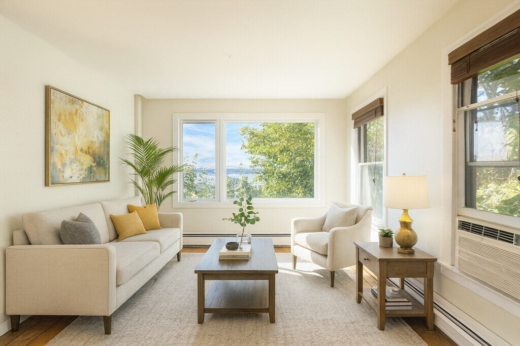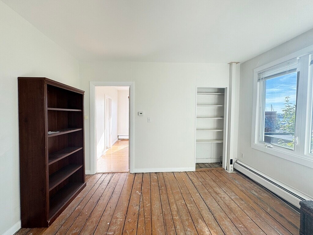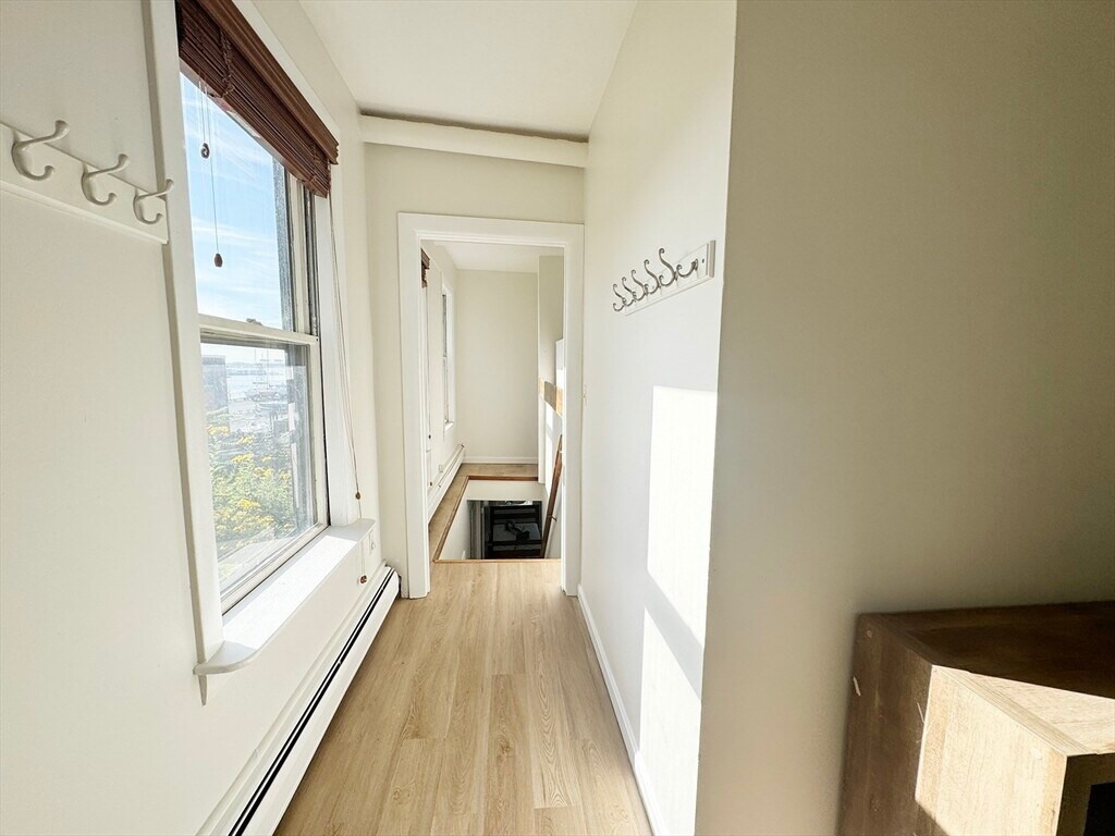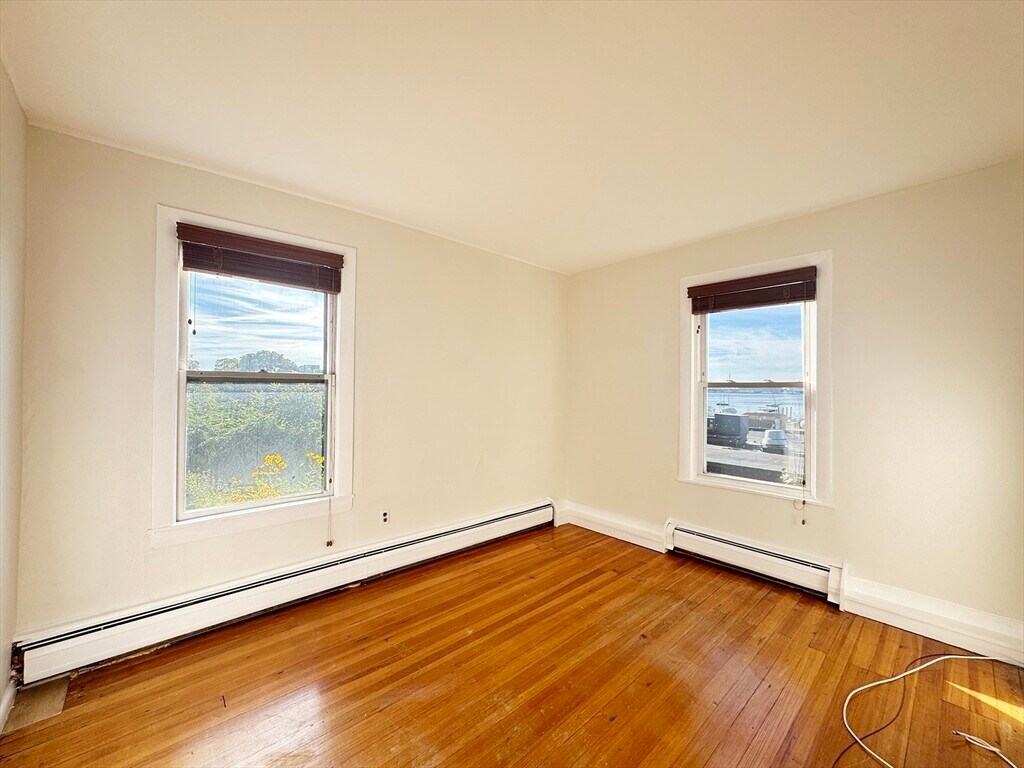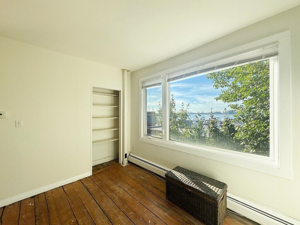 CHARMING AND UNIQUE 1650+ SF bilevel 3+ bedroom/ 2 bath unit nestled off Webster Street with shared roof deck with best views of Boston Harbor! Freestanding property offers views from every window,gas lamp entrance,grape vines,a small entry deck for morning coffee! Enter into a sunlit entry hall with new weather-resilient vinyl flooring. On the main level you’ll find antique pine floors,an open concept dining room,living room,and alcove kitchen with wood counters. A picture window frames Harbor views. Bedroom off the living area could also function as an office,featuring both harbor and garden views. The lower level is spacious with full windows,three additional rooms,and a full bath. Common laundry with outdoor access is located on this level. Unit just painted,new carpets and flooring. A perfect spot to live while exploring Eastie,with great access to the City,highways,and more. First month,security deposit and excellent credit and income required. Tenant pays heat/hw MLS# 73434349