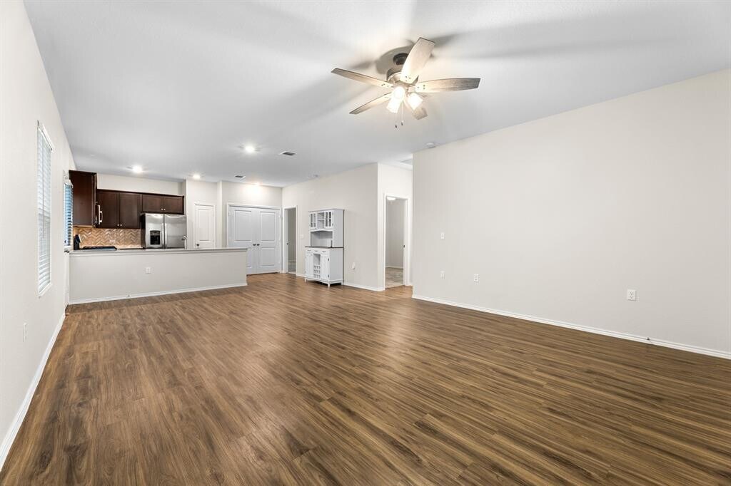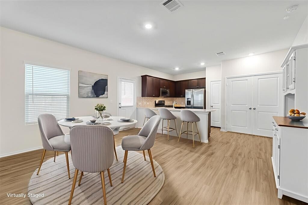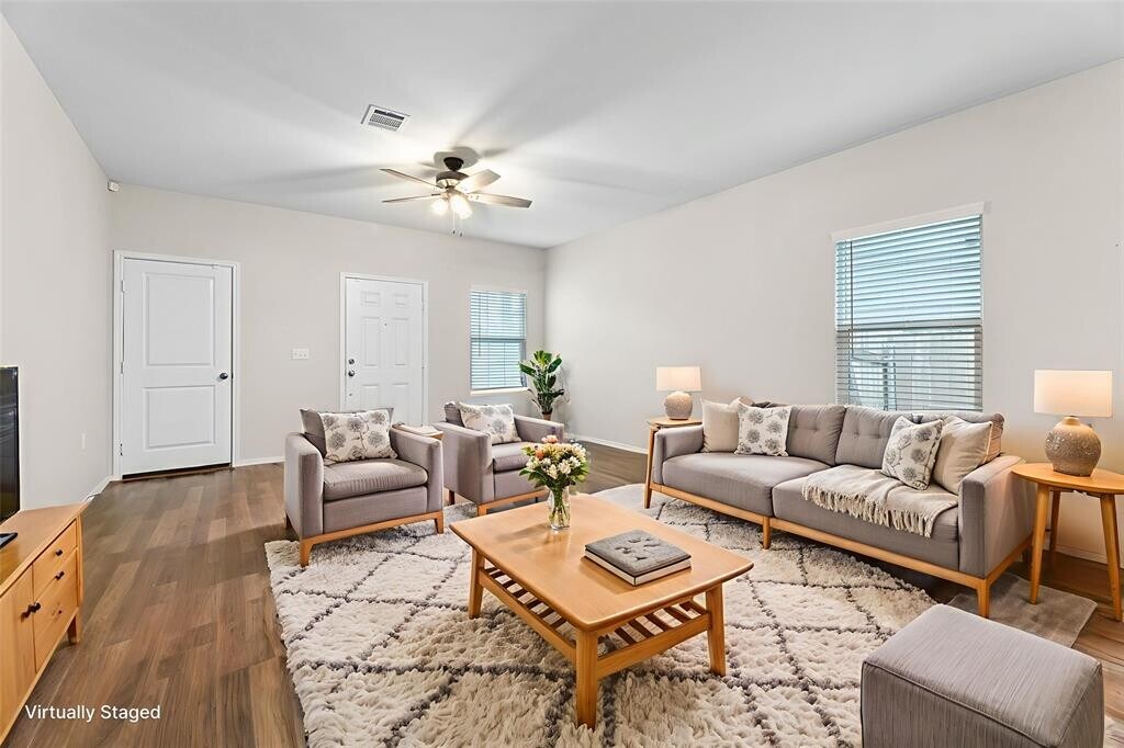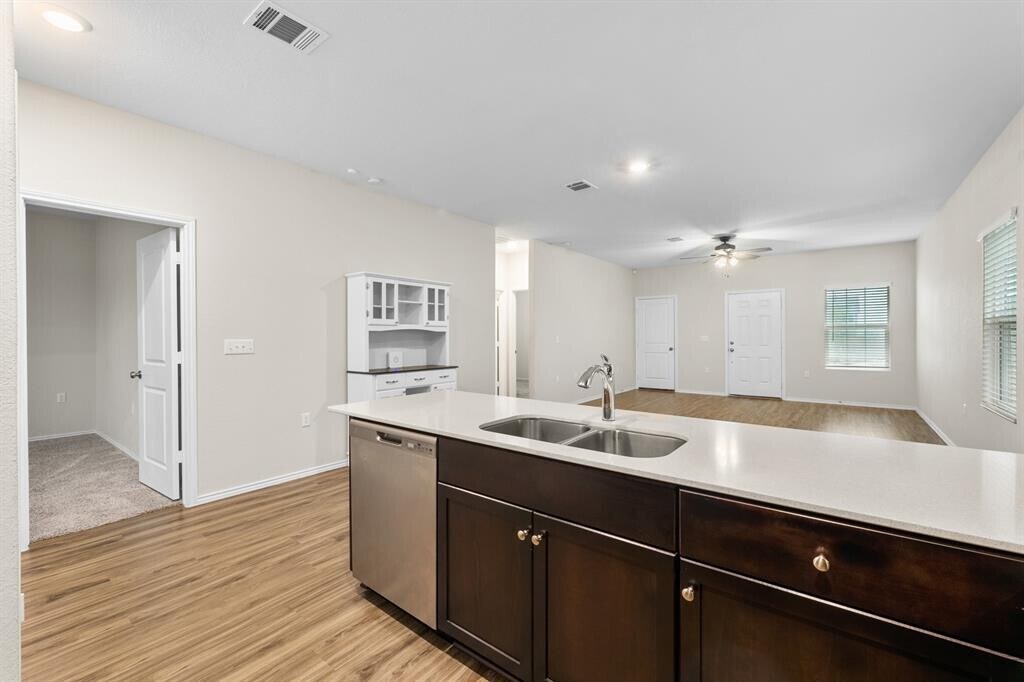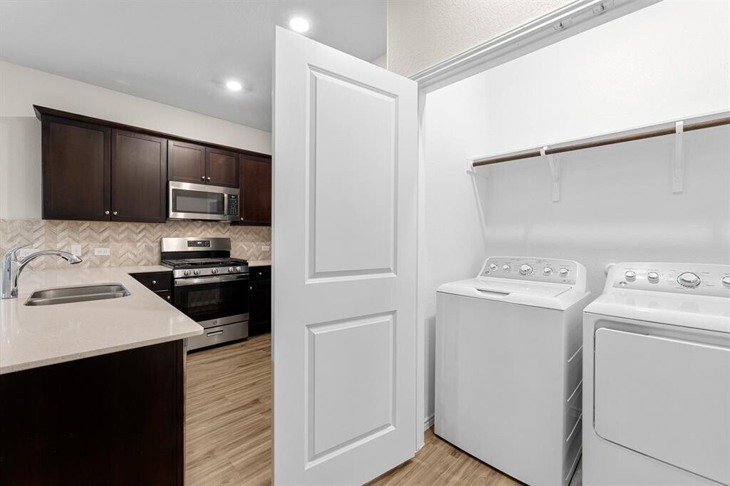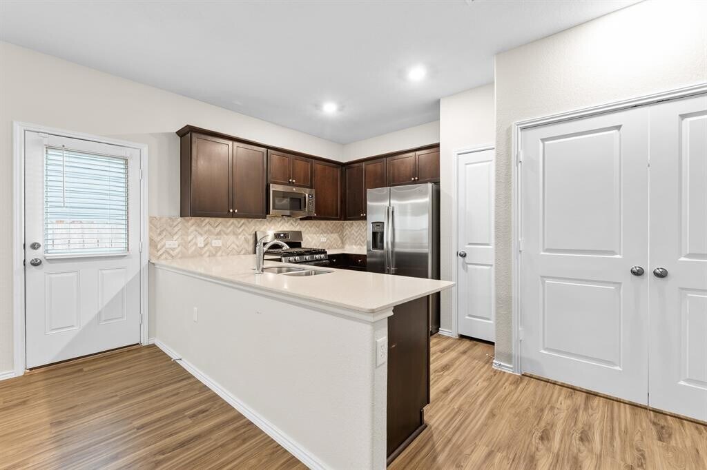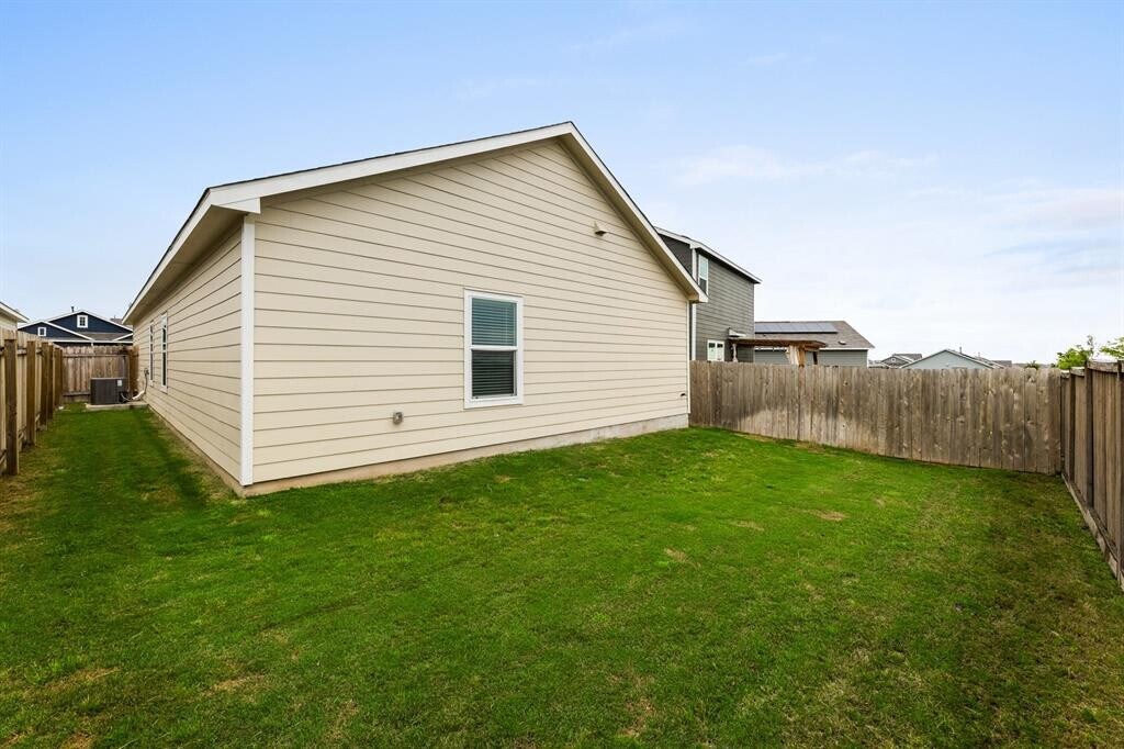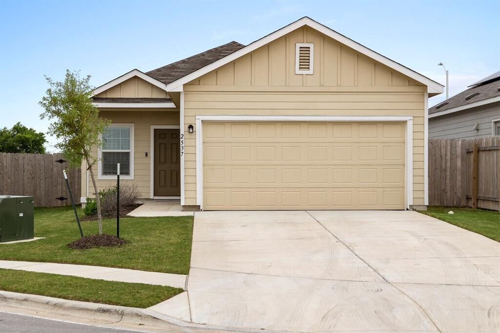 This charming single-story home offers three bedrooms and two full bathrooms in a thoughtfully designed layout. The kitchen features rich dark wood cabinets, a stylish geometric tile backsplash, stainless steel appliances including a refrigerator, dishwasher, microwave, and gas range, plus a pantry. A washer and dryer are also included, adding to the move-in ready appeal. Ceiling fans, laminate flooring in the living areas, and natural light throughout create a comfortable and welcoming atmosphere. Added features such as solar panels and a water softener bring efficiency and convenience to the home. Located within walking distance to the community amenity center with a pool and playground, this home also provides an easy commute to major employers such as Dell, Samsung, and Tesla, as well as quick access to downtown Austin. With shopping, dining, and entertainment just minutes away, this home blends convenience, comfort, and lifestyle.