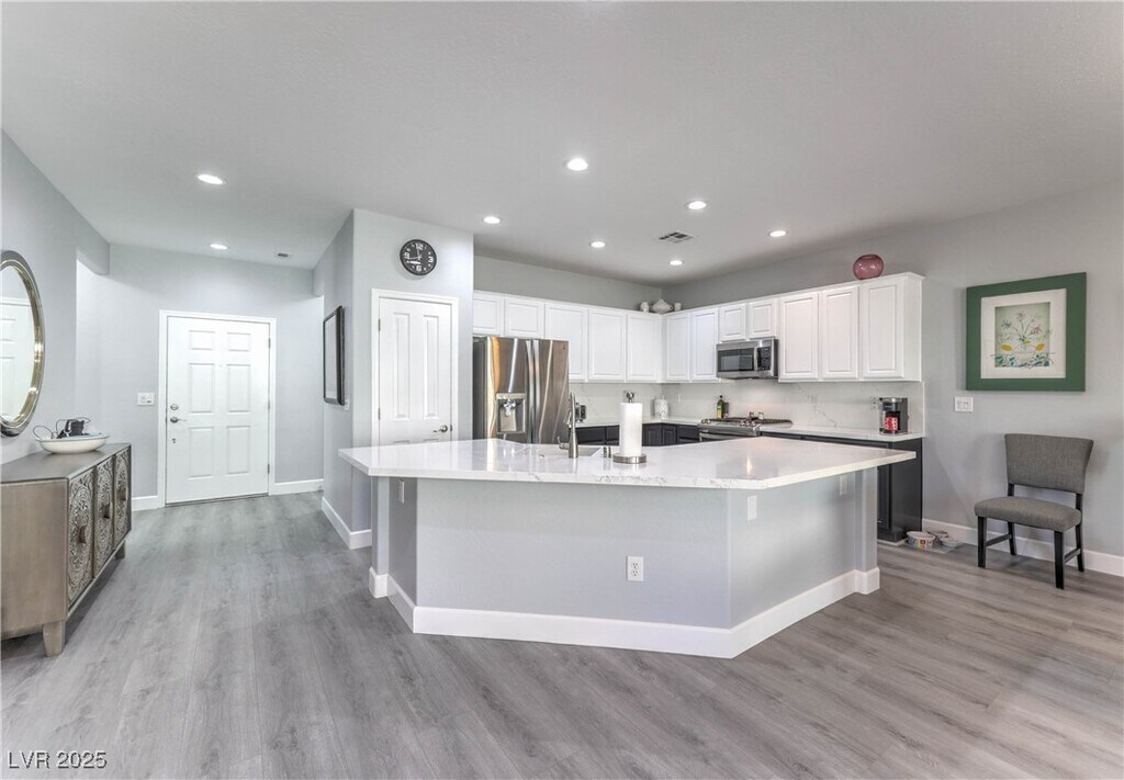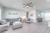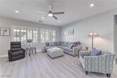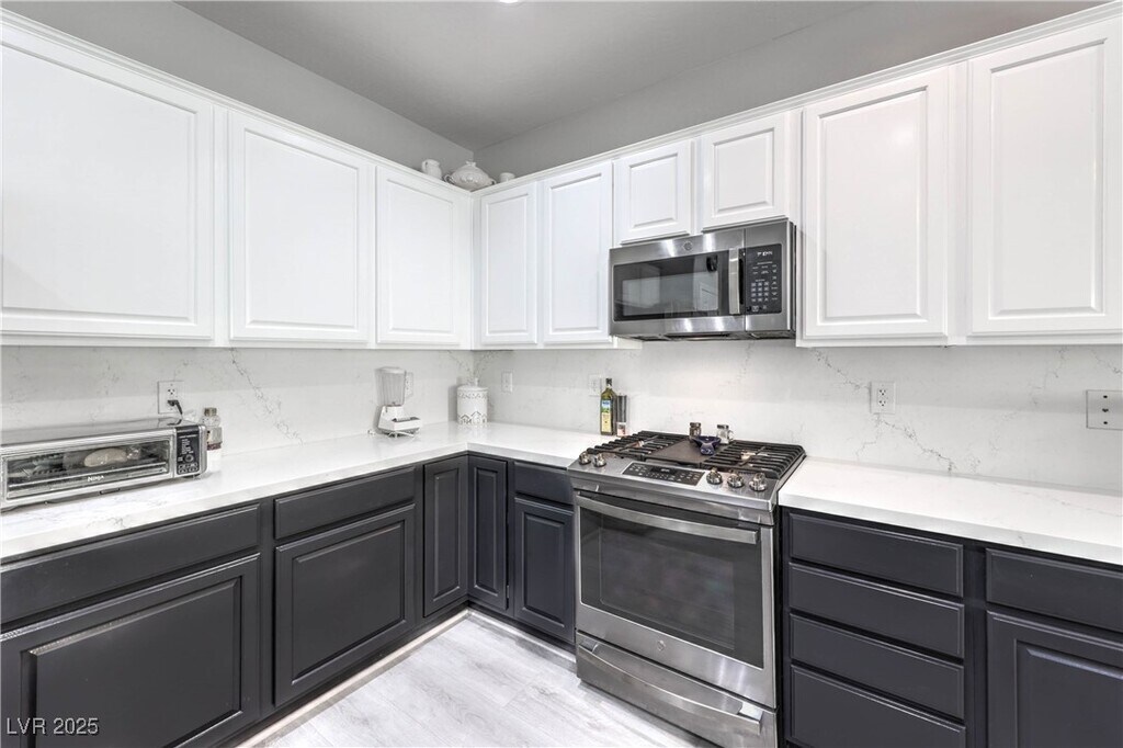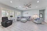 Beautifully updated Whitney floorplan offering approx. 1,596 sqft with 2 bedrooms, den/office, & 2 baths. Features include laminate wood flooring throughout, custom two-tone interior paint, upgraded baseboards, & plantation shutters. Island kitchen with quartz counters, upgraded cabinets with pull-out shelves, breakfast bar, recessed lighting, pantry, and stainless steel appliances. Great room with ceiling fan and recessed lighting. Spacious dining area with tile flooring and sliding glass door to backyard. Owner’s suite includes ceiling fan, walk-in closet, raised vanity, dual sinks, and shower. Secondary bedroom with ceiling fan and secondary bath with raised vanity and tub/shower with enclosure. Laundry room with washer/dryer, security door, 2 car garage with epoxy floors, cabinets, & overhead storage. Backyard includes a covered patio, gas BBQ stub, synthetic grass, and mature low maintenance landscaping. Fabulous Solera at Anthem (55+ Age Restricted Community) amenities included!