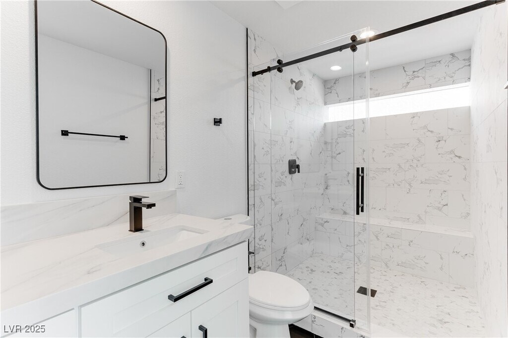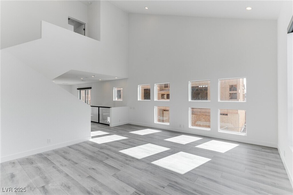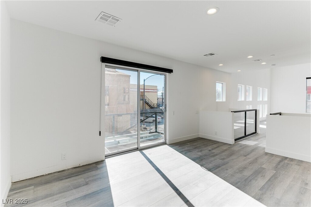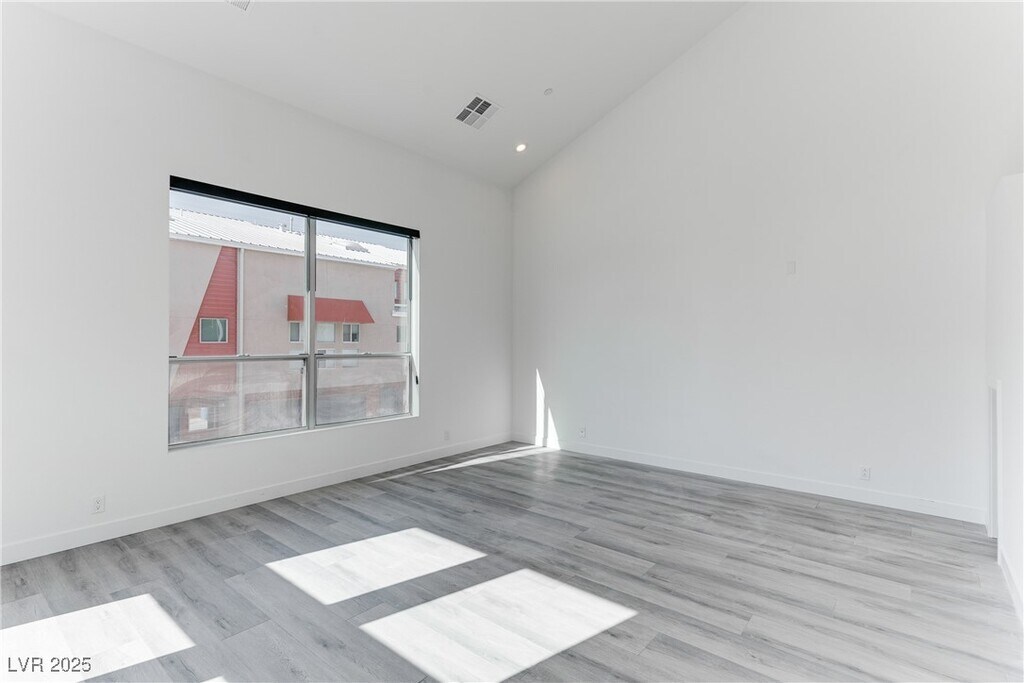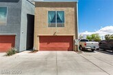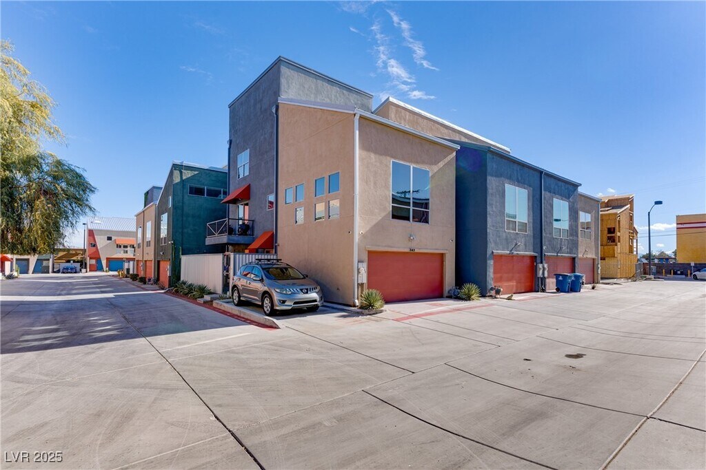 Discover this stunning loft-style townhome in the heart of Downtown! Spanning three levels, this home features a private yard, attached two-car garage, and modern design throughout. The first floor offers a bedroom, full bath, and versatile den with sleek concrete flooring. On the second floor, enjoy an open-concept kitchen, dining area, and living room with soaring vaulted ceilings, abundant natural light, and access to a private balcony. The top floor boasts a spacious primary suite with dual sinks and a large walk-in shower. Plus, take in breathtaking Strip and city views from both the second and third floors!