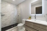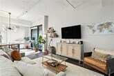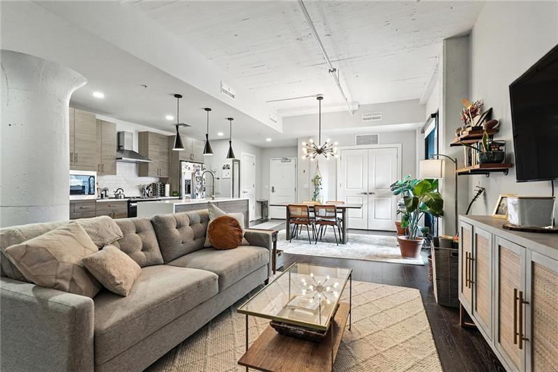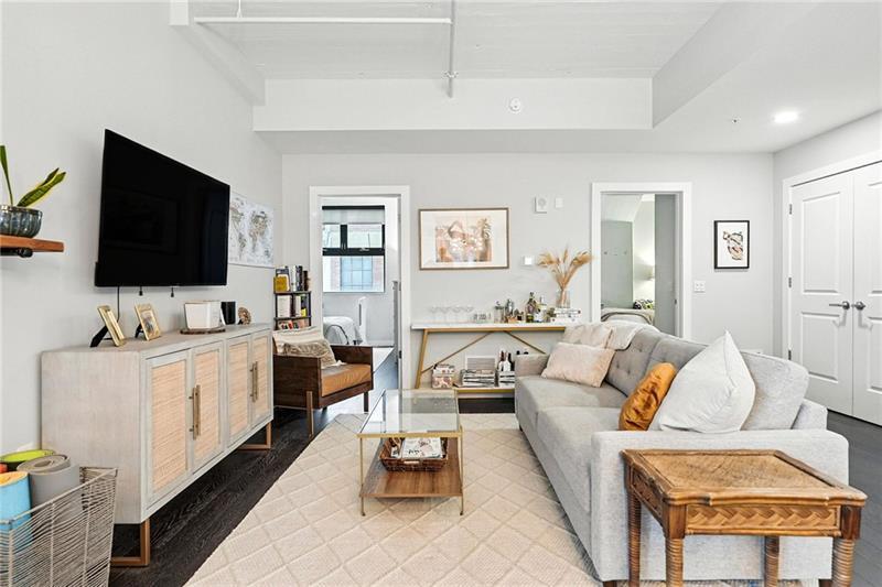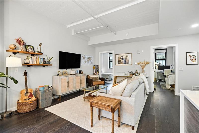 Welcome to your own slice of city living in Pgh’s dynamic Strip District. This thoughtfully designed home features 2 spacious bdrms, each w/ its own full bath & custom closet. A true escape, the primary suite includes a dual vanity & a sleek wet room shower w/ a luxurious freestanding soaking tub. The kitchen is a true centerpiece w/quartz countertops, a stunning waterfall island, GE appliances w/vented hood, & upgraded lighting. The open fl plan provides plenty of space for both living & dining areas while maintaining the building’s architectural integrity w/ a distinctive column & exposed concrete ceilings. Enjoy your morning coffee or unwind after work on the private outdoor patio. A laundry closet & a half bath complete this unit. Included garage parking—a major perk for city living. Building amenities include a lounge, rooftop terrace w/ a firepit & grill, & fitness center. Step outside to some of Pgh’s best dining, markets, & the riverfront trail. LERTA tax abatement thru 2030.