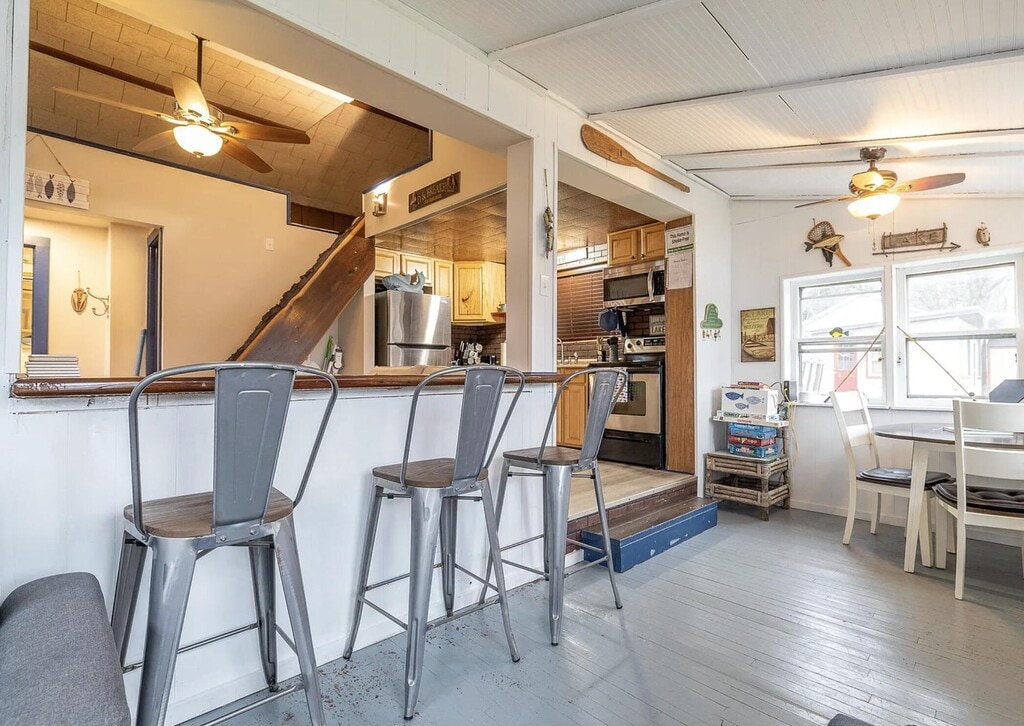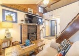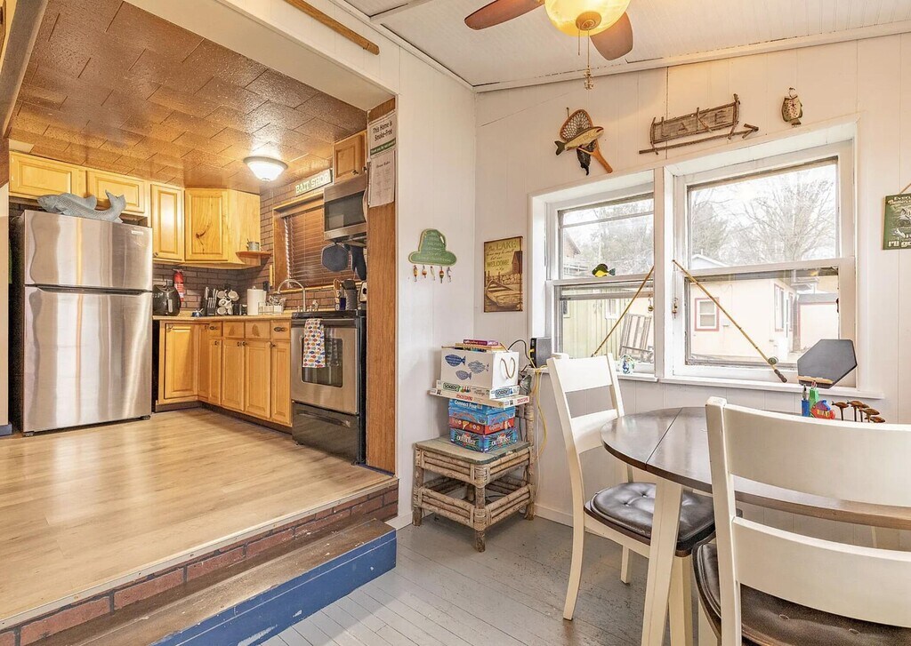 Charming,fully furnished waterfront cabin available for lease beginning 4/1/26,offered monthly or for a one-year term. Known as Fish Tales,this cozy,fish-themed retreat is located on a best-kept-secret all-sports lake with peaceful,unobstructed views of greenery. Enjoy stunning sunsets to the left and beautiful sunrises to the right,along with exceptionally clean water that is ideal for swimming. The home features a fully equipped kitchen with all stainless steel appliances,breakfast bar seating,a cozy living room with Smart TV,and a bright sunroom with dining area overlooking the lake. There are two bedrooms,including a main-level bedroom with a double bed and an upper open-air loft bedroom accessed by steep stairs with limited headroom,offering a queen bed and a twin bed. Recent updates include a brand-new mini-split system for heating and air conditioning and a new roof. Outdoor amenities include a dock,bonfire pit,kayaks,canoe and direct lake access for boating,jet skiing,and fishing,with a small amount of storage available. Parking is limited to two spaces,one on the front parking pad and one in front of the garage. Non-aggressive dog breeds may be considered. The property offers quiet,scenic lake living in a cozy waterfront cabin. Come stay at Fish Tales!