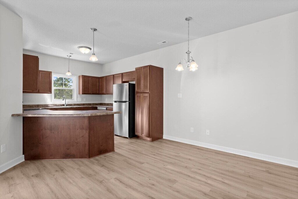 Welcome to this adorable, almost new, 3 Bedroom 2.5 bath townhome w/ garage in Holly Ridge--close to the Surf City shopping and beaches, and just hop onto Hwy 17 to quickly travel north to Camp Lejeune or south to Wilmington. Enter this bright and modern home and travel through an arched doorway into an open living area. Connected is a spacious kitchen with stainless steel appliances and plenty of counter and cabinet space. The beautiful LVP flooring along with the cabinetry creates a warm, inviting space throughout. Also downstairs is a chic half-bath. Enjoy the separate laundry closet with washer/dryer hookups. Upstairs, you will fall in love with the expansive Primary Suite with huge walk-in closet, double sink vanity, and oversized shower with dual shower heads! Two more bedrooms with closets and another full bath. Spend summer nights on your covered back patio overlooking the back yard and tree line. This is the perfect place to call home! This home is pet-friendly with owner approval and an additional monthly pet rent. We strive to provide an experience that is cost-effective and convenient. That’s why we provide a Resident Benefits Package (RBP) to address common headaches for our residents. Our program handles insurance, identity protection, pest control, air filter changes, utility set up, credit building, rent rewards, group rate internet, and more at a rate of $53.95/month or $68.95/month with pest control, plus $65.00 for group rate internet/month, added to every property as a required program. More details upon application. Most homes come with high speed internet up to 1 Gig at a special group rate, with premium support and setup to get you connected fast at move-on.