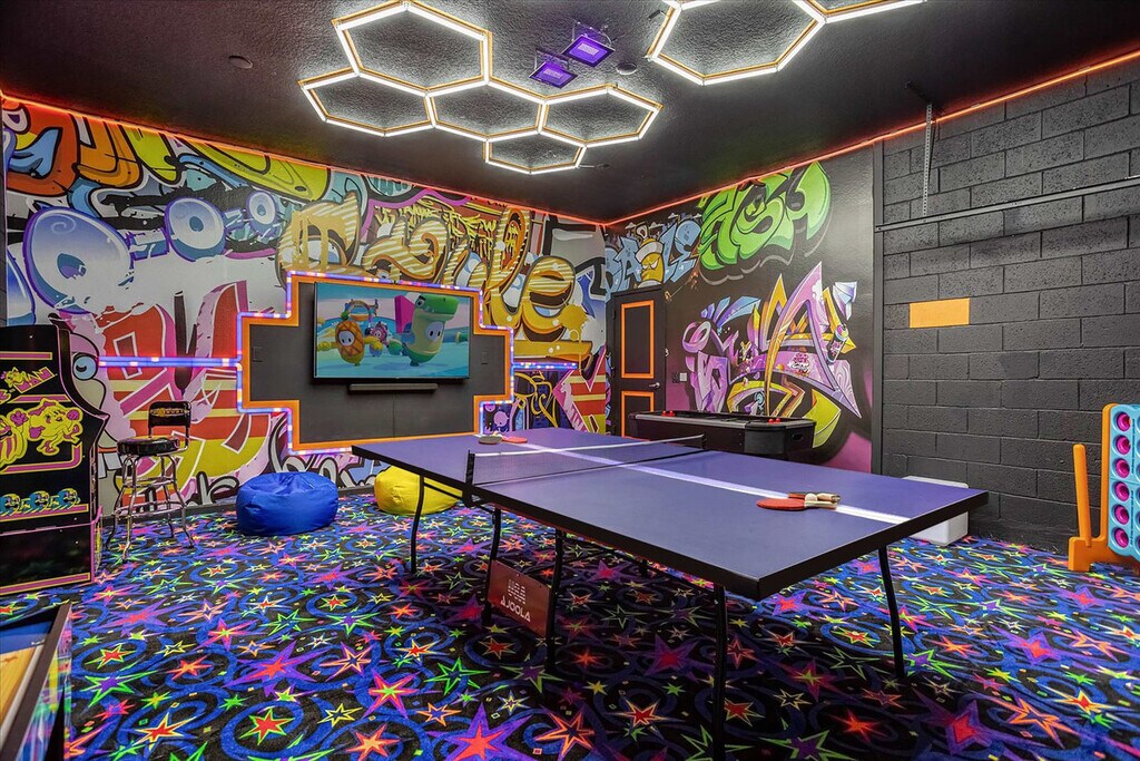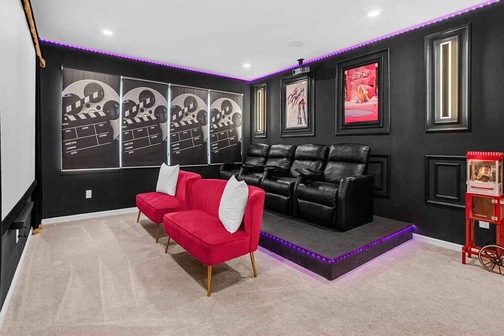 Feel at home in this beautiful Veranda Palms Resort home, large enough for 26 guests. Located less than 20 minutes from Disney, this 12-bedroom, 11.5-bathroom vacation home is the ultimate retreat for large families and group getaways. This apartment features a private swimming pool and spillover hot tub with a removable safety fence, a furnished patio with loungers and poolside dining set-up, and a BBQ grill. Enjoy a loft movie theatre with a projection screen, reclining chairs, and a popcorn machine, a billiards table in the theatre lounge, and a garage-converted game room with arcade games, air hockey, table tennis, and skee-ball. Smart TVs are in every room, and high-speed internet is available. The fully equipped gourmet kitchen features high-end appliances, two large fridge/freezer combos, and two large capacity dishwashers. There is a dining table for 10 and a kitchen island with seating for 3. The open-concept living area has comfy seating and a Smart TV. In-home laundry machines and central A/C are available throughout. Pool and hot tub heating is available for an additional fee of $35/night per service and $60/night for both, with a minimum stay of 2 nights. A "Pack 'N Play Crib" and a highchair are available for one-time fees of $40 each. A one-time refill for the propane tank for the BBQ is available for $55. Located in the sought-after Veranda Palms Resort, you’re just minutes from Disney and Orlando’s top attractions. Just off Hwy 192, you’re minutes from world-famous theme parks, championship golf courses, outlet malls, and dozens of restaurants. Nearby family attractions and destinations include Lake Buena Vista Factory Stores, Kissimmee Lakefront Park, Falcon's Fire Golf Club, Old Town Kissimmee, Fun Spot America, Celebration Town Center, ESPN Wide World of Sports Complex, Gatorland, Walt Disney World Resort, SeaWorld Orlando, and Osceola Heritage Park. Parties, events, and smoking/vaping of any kind are prohibited in or around the property and risk a fine of $150. Late departures will result in a fine of $150 for each additional hour the property cannot be accessed for turnover. Outside of service animals, pets are not permitted at this property, and any evidence of pets will result in a fine. Mid-stay cleaning is available for reservations over 3 days in duration and must be arranged ahead of time. [SI]