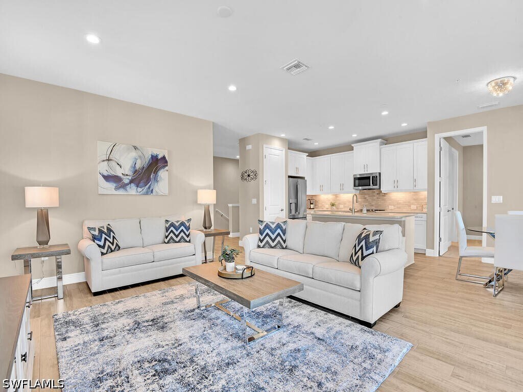 This beautifully appointed second-floor coach home is situated in the brand new community of Seychelles in southeast Naples. Offering lake views from the screened and fully furnished lanai,the unit has a light and bright feel,perfect for soaking in the sunny Naples weather! From the ground floor of the two-story building,enter through your one-car garage or the front door and a private staircase takes you up to the second floor home - the top floor,no one above you! The contemporary floor plan has an open kitchen with quartz island,dining area and spacious living room overlooking the lanai and lake. The primary bedroom has a queen size bed and en suite bath with gleaming quartz dual sink vanity and a walk out shower. The guest bedroom has another queen size bed and the guest bathroom has a tub/shower combo. The den is enclosed with glass french doors and has been converted to serve as a third bedroom with a queen size bed with twin size trundle pull out. A laundry room with full size washer and dryer completes the package for this perfect Naples home! Outside your door,Seychelles has wonderful community amenities including a state of the art fitness center,resort-style pool and spa,outdoor grill,and a clubhouse. Conveniences including CVS,multiple grocery stores and many restaurants are located within a few miles of the Seychelles gates. Downtown Naples beaches and 5th Ave S are a quick 10-15 minute drive.