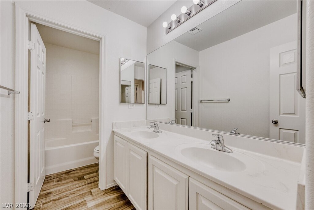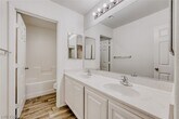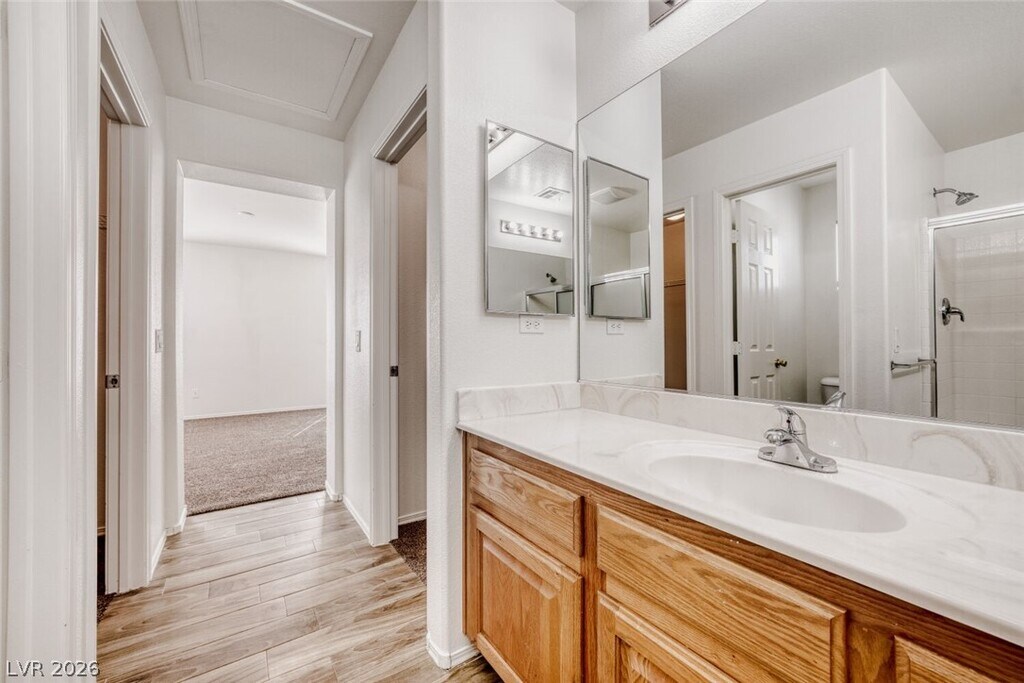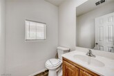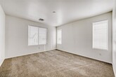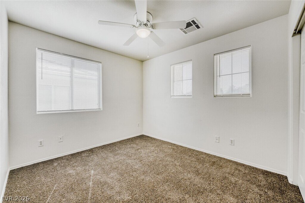Has 4 bedrooms, 2.5 bathrooms, a formal living and dining area, a separate family room, and an attached 2-car garage with direct entry, with convenient access to shopping, schools, and the 215 freeway. The entry foyer features tile flooring and a vaulted ceiling. The formal living and dining areas include carpeting, recessed lighting, and window blinds, while the family room has wood laminate flooring, blinds, and a gas fireplace. The kitchen and breakfast area offer tile flooring, recessed lighting, a center island, and all appliances. Upstairs includes all bedrooms, a laundry room with tile flooring, and two full bathrooms; the secondary bathroom has a double sink vanity and a one-piece tub/shower combo. The primary bedroom includes window blinds and two walk-in closets, with an en-suite bathroom featuring tile flooring, a double sink vanity, and separate shower. The backyard includes desert rock landscaping and a vinyl fence. Trash, sewer and tenant portal fee are included in rent!