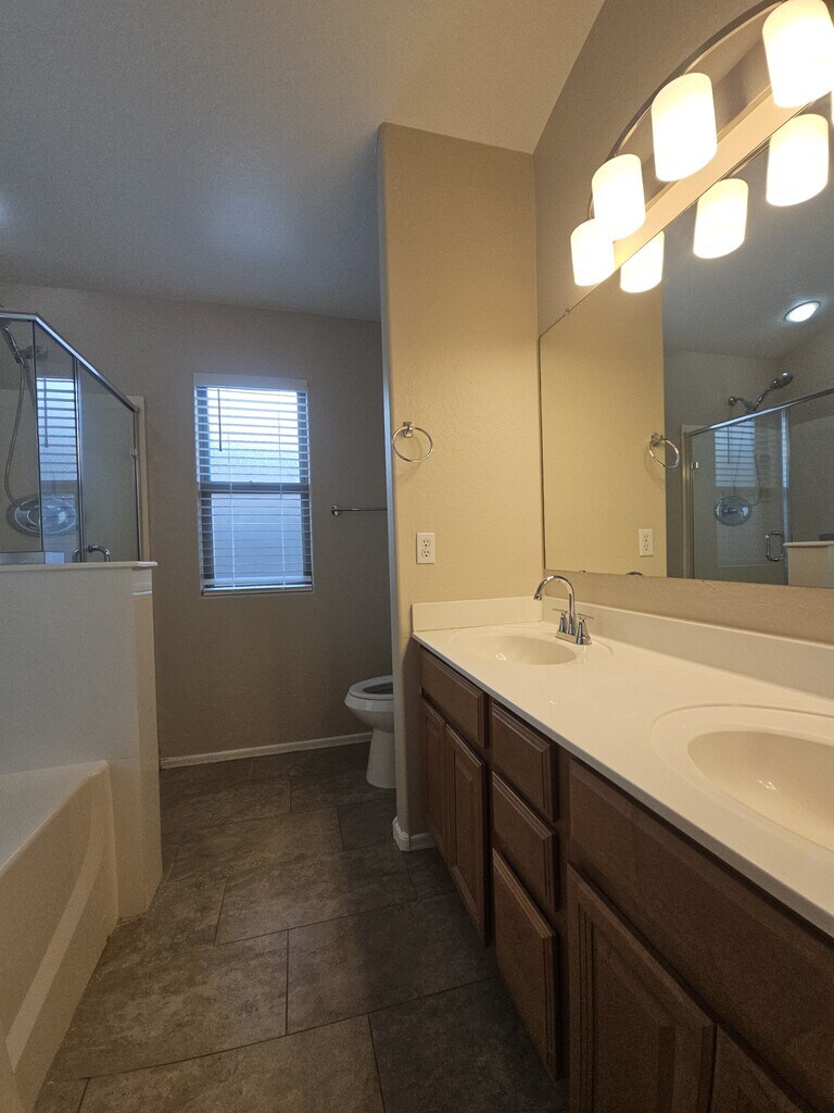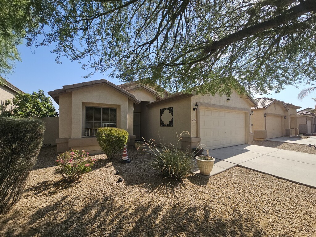 Don't miss this beautiful home. The kitchen features maple cabinets, new granite counter tops with under mount stainless sink and nickel faucet, black appliances and a pantry. The living room is open to the kitchen with vaulted ceilings. Washer and dryer included! The primary bedroom has a large walk in closet. The primary bath has double sinks, a separate shower and soaking tub. This house has been upgraded with granite counter tops, 12'' x 24'' staggered laid tile and quality carpet. The 2 car garage has an epoxy floor and a new water heater. The backyard features a must have covered patio. This house is move in ready.