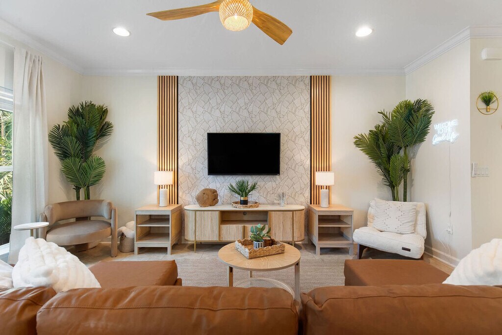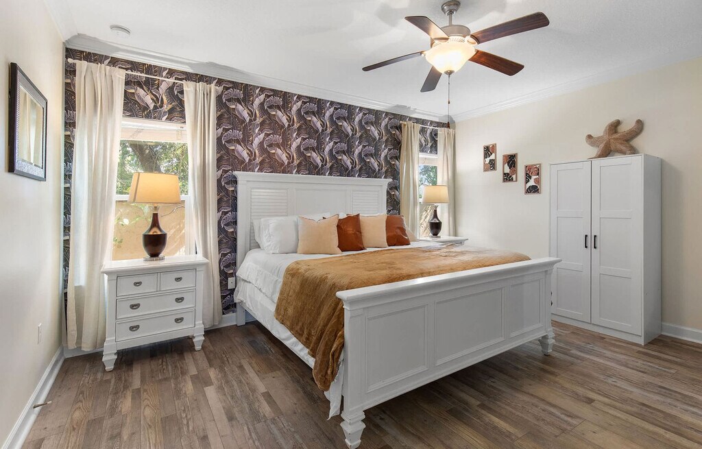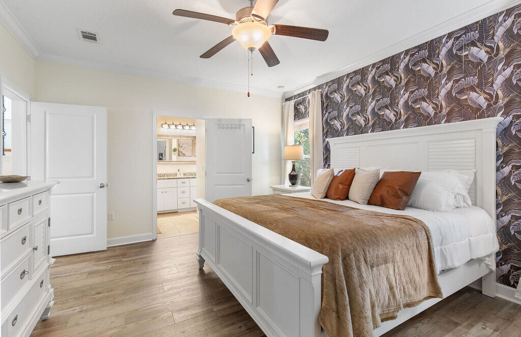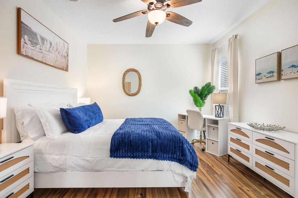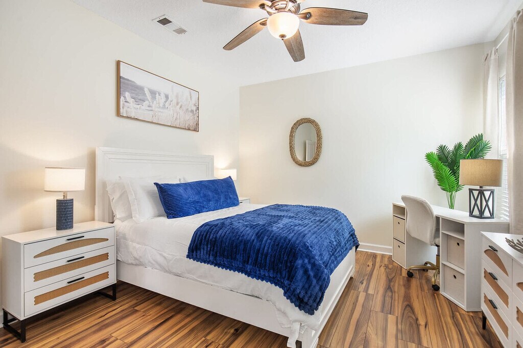 Welcome to your Beachside Escape in Destin! This beautiful 4-bedroom, 3.5-bathroom coastal retreat features an arcade room, coffee bar, and dedicated workspace. Enjoy community perks like a pool, hot tub, and free seasonal beach shuttle—all just minutes from the sugar-white sands of Destin! This spacious home sleeps up to 12 guests comfortably, making it perfect for family vacations, group getaways, and memory-making with friends. With a bright open floor plan, stylish bedrooms, and fun entertainment spaces, it’s the ultimate spot to relax after a day of sun and adventure. The main floor includes a King Master Suite with Smart TV, ensuite bath, and plush seating, a chef’s kitchen with high-end appliances, large island seating, and coffee bar, and a living room with a large leather sofa, Smart TV, and open flow to dining. The upper floor features a Queen Suite with ensuite bath and remote work desk, a Queen Bedroom with balcony access, a Bunk Room with 2 twin bunk beds (sleeps 4), and an arcade/game room with air hockey, arcade games, and a leather couch. This home includes 12 wristbands for guest use to access the community pool. All guests ages 5 and older are required to wear a wristband for entry to the pool. A $50 replacement fee per wristband will be charged for any that are lost or missing. The resort-style community pool is open daily from 10:00 AM to 10:00 PM, featuring a zero-entry walk-in area, three stunning waterfalls, and beautifully landscaped surroundings. With plenty of seating and lounging areas, it’s the perfect spot to soak up the Florida sunshine with family and friends. Nearby attractions include Destin Commons, an open-air shopping, dining, and entertainment hub just 0.5 miles away, and Henderson Beach State Park, with sugar-white sands, emerald waters, nature trails, and picnic areas, located 2.0 miles away. Big Kahuna’s Water & Adventure Park is 3.2 miles away, offering water slides, lazy rivers, mini-golf, and thrill rides. Destin Harbor & HarborWalk Village, 5.8 miles away, features waterfront shops, dining, live entertainment, and boating. The Destin History & Fishing Museum is 6.5 miles away, where you can explore the history of “The World’s Luckiest Fishing Village.” Nearby restaurants include Pazzo Italiano, Bric à Brac, Beach Walk Café, Marina Café, and The Village Door at Baytowne Wharf. Getting around is easy with car rentals and rideshare services like Uber and Lyft readily available. The complementary Village of Crystal Beach Shuttle offers convenient access to the beach. Check-in is at 4pm and check-out is at 10am. No pets allowed. No parties allowed—violations may result in immediate termination of the stay. An exterior camera is installed solely to monitor our cleaning team for quality and security purposes. Parking in the driveway is limited to 2 cars, and street parking is not allowed. Guests must be 25 years or older to book this property. A guest verification process is required within 48 hours of booking confirmation. Once verified, guests will be asked to sign a Rental Agreement and provide a valid government-issued ID and a matching credit card before check-in. A non-refundable $60 damage waiver is required, covering accidental damage during your stay, as long as it is reported prior to check-out. Includes a remote work desk for working on the go.