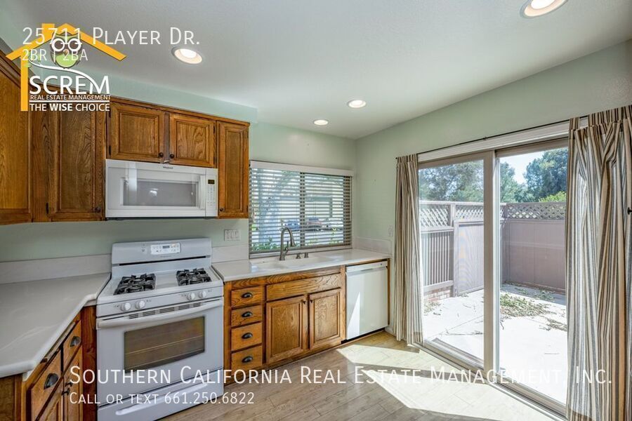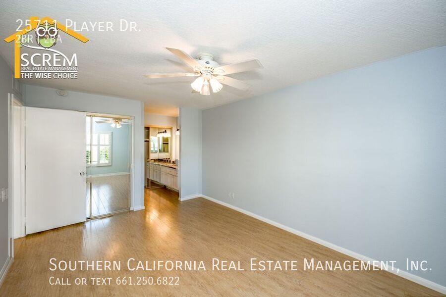 Charming single-story, 2-bedroom condo located in the highly desirable Valencia Fairways community. This light and bright home welcomes you into a spacious living room featuring vaulted ceilings, shutters, beautiful wood flooring, and a ceiling fan. The living area flows seamlessly into the dining space and kitchen, which offers recessed lighting, warm wood cabinetry, and essential appliances, including a gas stove, single oven, microwave, and dishwasher. A sliding glass door provides access to a private patio. The spacious primary bedroom features shutters, a ceiling fan, two mirrored closets, and a beautifully updated en-suite bathroom with a walk-in shower. The secondary bedroom includes a ceiling fan and mirrored closet doors, with convenient access to a nearby bathroom that also has a walk-in shower. Additional highlights include an attached garage with ample storage, as well as washer and dryer hookups with a utility sink for added convenience. You'll have access to three separate HOA pools and spas in this beautiful community, and the golf course is within walking distance. Shopping, restaurants, and the 5 Freeway are conveniently close. *Owner may consider a small pet. **The owner will provide a refrigerator if the tenant does not bring their own. For inquiries about this property, please email . To schedule a viewing appointment, visit