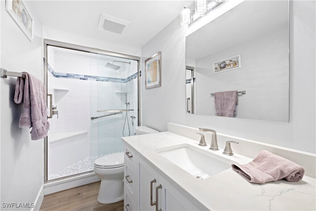 ompletely renovated unit located in this gulfside tropical paradise which is all about the beach at this charming 2-bedroom,2-bath,5th floor condominium. Panoramic views from the lanai,kitchen and living area. Features include white shaker cabinets,stainless appliances,tile throughout,comfortable living area with sofa,chairs,flat screen TV,and dining for 6 people. Primary bedroom includes king bed with ensuite bathroom and walk-in closet. The guest bedroom feature two double beds and walk-in closet. Bathrooms are walk-in showers with handicap handlebars in each shower. There are private balconies from both the primary and guest bedroom. Wireless internet and cable included for your convenience. Washer and Dryer in unit or there is a large capacity washer and dryer in the common laundry room. Bonita Beach Club is a beachfront,tropically landscaped,gated community located on Hickory Blvd at the very North end tip of Bonita Beach! Offering many amenities,you are sure to never get bored. Amenities include an 80-ft. heated community beachfront pool,fitness center,tennis courts,4 Pickleball courts,yoga and water aerobics available during season,billiards room,library,social room,project room,game room,lounge,BBQ area,shuffleboard,car wash area,fishing,direct beach access and so much more! All amenities have been renovated and are beautiful design with stunning decor.