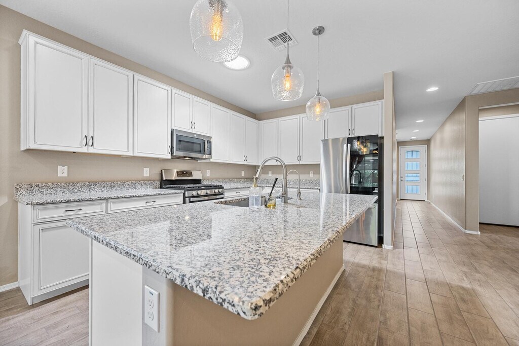 Welcome to this beautifully upgraded four-bedroom,three-bath Queen Creek residence offering a rare and highly sought-after multi-generational floor plan. Designed for flexibility and privacy,this home includes a separate mother-in-law suite,ideal for extended family,guests,or even a private home office,making it one of the most versatile layouts in the area. With over $37,000 in upgrades,this home blends modern style with long-term functionality. Inside,you'll find tile flooring throughout the great room and four bedrooms,a fresh two-tone designer paint scheme,and six solar tubes that fill the home with natural light while improving energy efficiency. All three bathrooms have been enhanced with granite countertops. Apply today