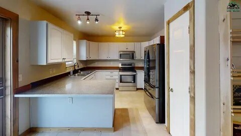 Beautiful 3 BR 2 BA home tucked away on a little over 2 acres. A two car heated garage helps make winters a bit easier, garage has lots of storage space. The neighborhood is beautiful. Long private driveway makes this property an amazing family retreat. Upon entering the downstairs living room with pellet stove helps lower heat oil costs, dining room is filled with light and opens to large private back yard and deck. Dining room adjacent to kitchen with lots of cabinets and counter top space with stainless steel appliances. Private master suite with full bathroom and large walk in closet completes the downstairs living. New carpeted stairs invite you to the second floor with a huge family room lots of light and two large bedrooms both have ample closet space. Another full bathroom has been recently updated. Details like ceiling fans throughout the house, wall sconce lighting, kitchen pantry, and room for kitchen counter stools makes this home inviting and comfortable. Close to Three Bears Market, North Pole Schools, easy drive to both bases. Active Duty military discount on deposit. Tenants pay own Electricity, heat oil, internet, responsible for garbage, must have Renters Insurance policy. Pet Deposit