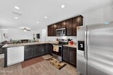 Beautiful home built in 2023 features 3 bedrooms,2 bathrooms,and a 2-car garage. This Home showcases a front porch,open-concept layout,luxury vinyl plank floors,neutral carpet,neutral paint,and ceiling fans in every room. Solar panels are paid by the landlord and generate monthly savings for you. Eat-in kitchen with expresso cabinets 42'' cabinets,granite counters,pantry,stainless steel appliances,and breakfast bar. Primary suite has large walk-in closet,walk-in shower,and granite vanity. Large backyard with covered patio. Centrally located home is near schools,parks,restaurants,shopping,entertainment,I-10,MC 85,and historic downtown Buckeye.