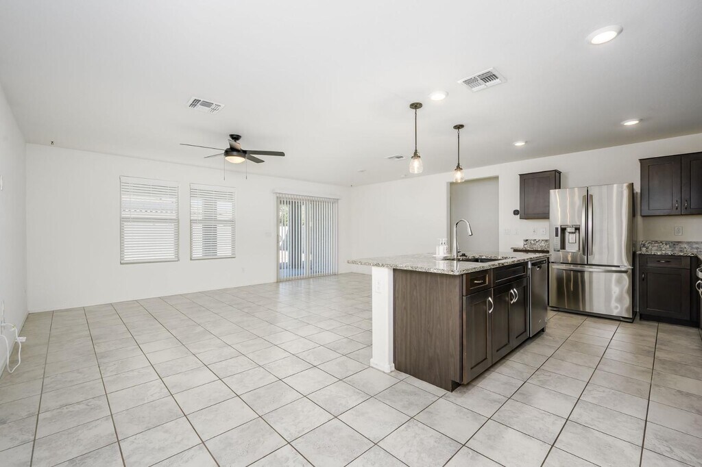 Welcome to this fabulous rental on a desirable corner lot with north/south exposure! Enjoy a perfect blend of comfort and elegance with a great room split floor plan, complemented by a separate formal dining area for entertaining. The modern kitchen features beautiful maple cabinets, sleek stainless and black appliances (including a fridge), stunning granite countertops, a separate pantry, and a kitchen island with a convenient pull-out faucet. Enjoy easy-to-maintain tile floors throughout, except in the bedrooms. The spacious master suite includes dual sinks, a walk-in closet, a linen closet, and a separate toilet room. Secondary bedrooms are thoughtfully split for privacy. Plus, enjoy a huge backyard with an extended covered patio, ideal for outdoor gatherings.
