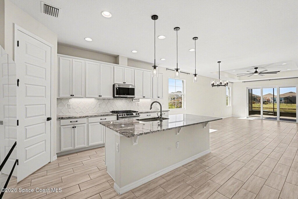 Beautiful 4BR,2.5BA Finley model in Pangea Park at Viera! This open-concept home features spacious living and dining areas,with tray ceilings in both the primary bedroom and main living area,creating an elegant and airy feel. The large kitchen island,abundant cabinetry,and oversized walk-in pantry make this home ideal for entertaining. The primary suite offers a generous walk-in closet and large walk-in tile shower. The secondary bathroom includes a double vanity,providing added convenience for family or guests. Additional highlights include impact windows throughout,a designated laundry room,and an epoxy-coated garage floor. Step outside to the extra-large screened-in patio and enjoy peaceful water views. Located in Viera's premier master-planned community with easy access to I-95,top-rated schools,shopping,and dining. Community amenities include a resort-style pool,playground,tennis/pickle courts,and more! This home truly combines comfort,style,and location. MLS # 1070183