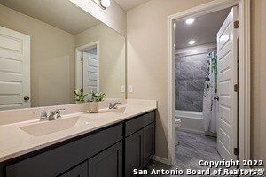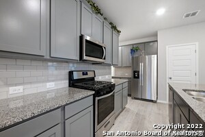 Washer, dryer, & SS fridge. 4/2.5 Build completed in 2022. Greenspace behind home. Fully landscaped. Sprinklers. Open plan. Light and airy. Wood-look tile flooring. No carpet DS (ex. Bdrm) DS 1/2 bath. Cov'd patio. Glam grey cabinets. Granite counters. Island. SS appliances. Gas stove. Walk-in pantry. Laundry room. 1st floor main bdrm with walk-in closet & OS shower. Game room. Fans. Storage. 2 blinds. Black-out drapes. 2-car garage. Comal ISD (verify schools, etc.). Near restaurants, live music & shops. Resolute Hospital, Historic New Braunfels and historic Gruene. Rivers, Lakes, Schlitterbahn, Historic New Braunfels. Freiheit County Store. Golf at The Bandit. Near Hwy 46 and I-35. Fast trip to IH-10. Listing broker is related to property owner."