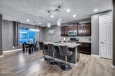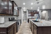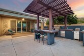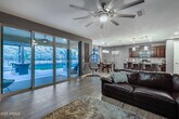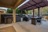 A Contemporary Arizona Gem being offered FULLY FURNISHED! Nestled on a slight hillside location with mountain views. This home boasts a large front courtyard area,plank flooring throughout,with a spacious great room with sliding doors leading to covered patio,outdoor kitchen,and pergola seating area. The chef's kitchen features a gas stove,granite countertops,stainless & black appliances,large island with breakfast bar,pantry,and ample cabinetry. The oversized primary suite offers a cool gray palette,electronic shades,and French door patio access. En suite includes double vanity,large walk-in shower,linen closet,separate water closet,and expansive walk-in closet. Split floorplan has two large additional bedrooms plus a flexible front room (office or formal living/dining). Laundry room has added cabinetry & space for an extra fridge. Low-maintenance yard with synthetic grass & custom lighting. Prime location near schools,shopping,dining,freeways,Paloma Community Park & Lake Pleasant. Move-in readyjust bring yourself!
