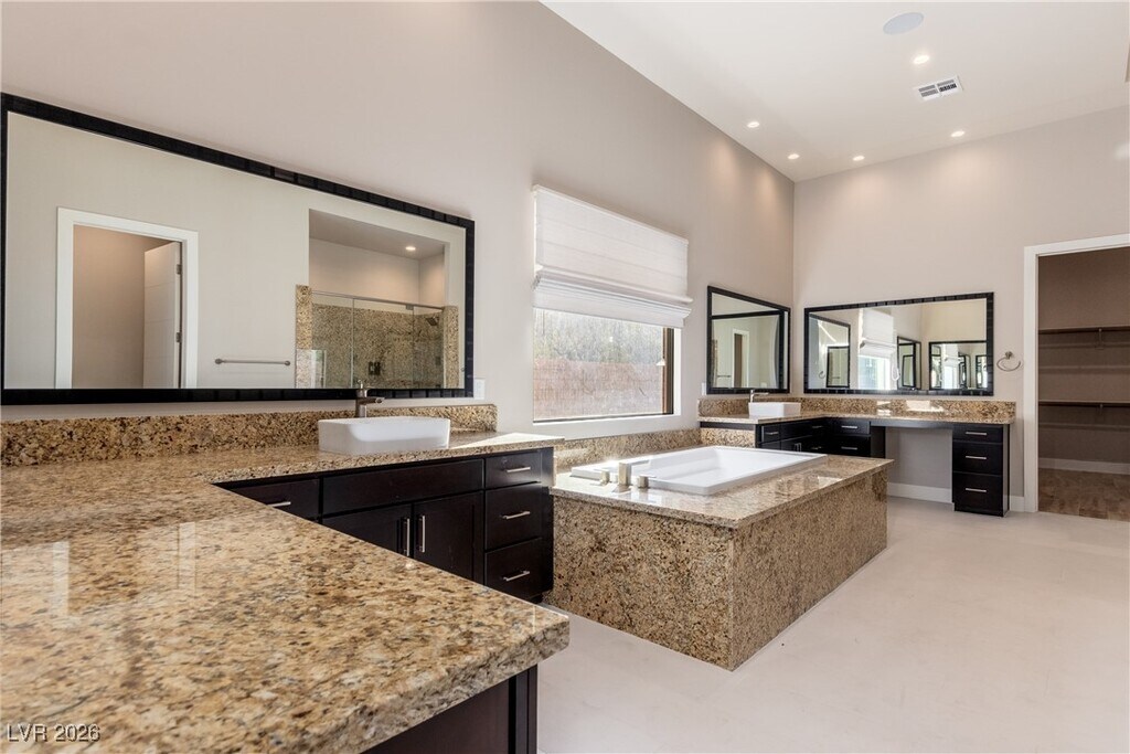 Experience refined luxury in this stunning single-story residence located in the guard-gated Ridges of Summerlin. Situated on a desirable corner lot, this 3-bed, 3.5-bath home with a den offers an exceptional blend of modern design and comfort. A glass-enclosed office provides a sleek, private workspace, while the open layout is accented by elegant marble flooring, custom cabinetry, and integrated LED lighting throughout. The upgraded kitchen features stainless steel appliances and beautiful stone and granite countertops, ideal for both daily living and entertaining. A dramatic backlit onyx wet bar and built-in audio system elevate the home’s entertaining appeal. The spacious 3-car garage adds everyday convenience. Step outside to a backyard oasis with a pool, perfect for relaxing or hosting guests year-round. This home offers a rare opportunity to enjoy luxury living in one of Summerlin’s most prestigious communities. Single-story living, premium finishes, and thoughtful details.