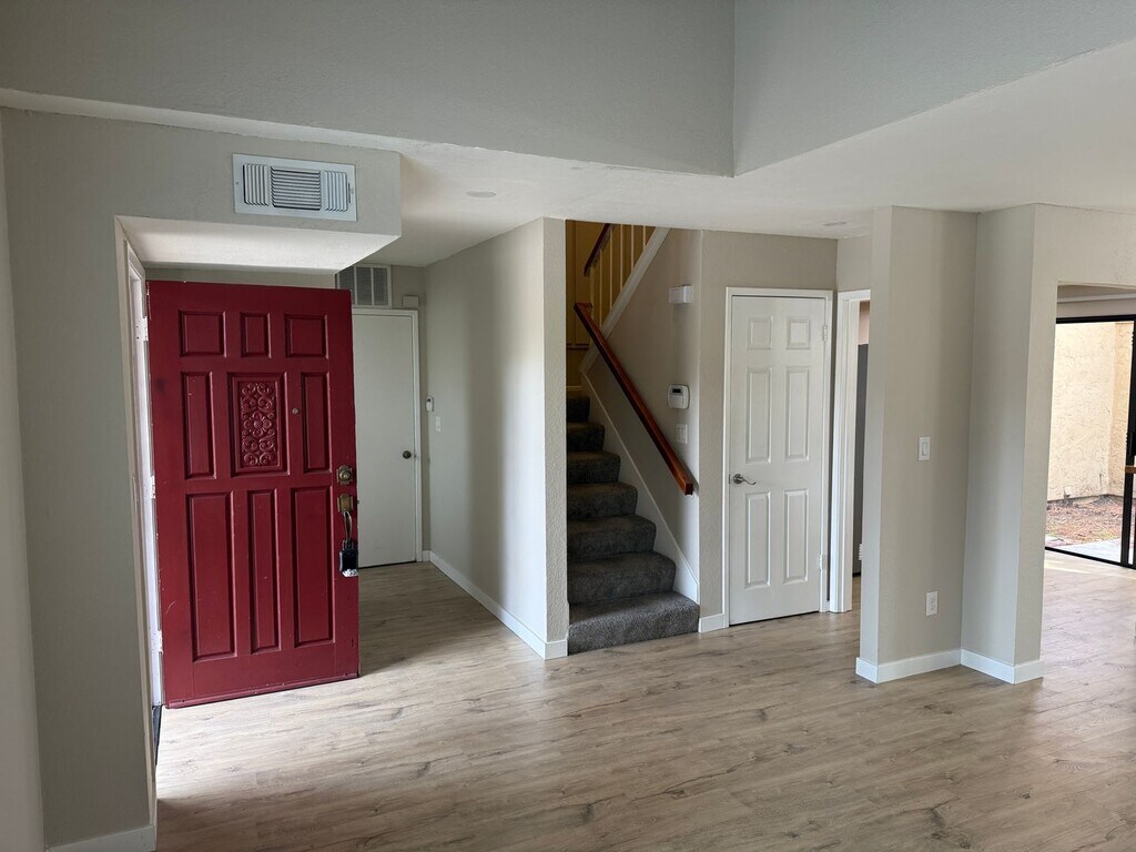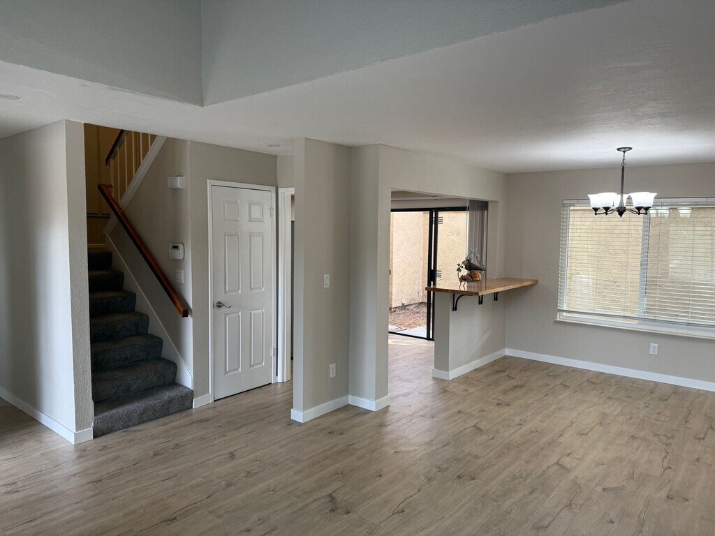 - 3 Bedroom 2.5 Bath 1,234 Sq. Ft. Condo - 2 Story on Corner Lot w/ 2 Car Garage - Updated Throughout w/ New Paint, New Flooring, New Switches and Outlets, Updated Kitchen and Baths - Entry Features: Front Security Door, Landscaped w/ Concrete Walkway - Living Room Features: New Vinyl Plank Flooring and Baseboards, New Paint, New Switches and Outlets, Dual Pane Window w/ Faux Wood Blind, Stone Fireplace w/ Mantle, Vaulted Ceiling - Dining Room Features: New Vinyl Plank Flooring and Baseboards, New Paint, New Switches and Outlets, Dual Pane Window w/ Faux Wood Blind, Modern Chandelier, Bar Stool Counter Area - Kitchen Features: New Vinyl Plank Floors, New Wood Countertops w/ Tiled Backsplash, Stainless Sink w/ Pull Out Sprayer, New Dishwasher, New Vent Hood, Pantry Cabinet, Breakfast Nook Area - Downstairs 1/2 Bath Features: Tile Floors, Newer Vanity w/ Granite Top, Frosted Dual Pane Window, Newer Lights - Stairs and Upstairs Hall Feature: New Carpet, New Paint, Built-In Cabinetry in Walls, Wood Rails w/ Painted Metal Banisters - Guest Bedrooms Feature: New Paint, New Carpet, Ceiling Fan w/ Remote, Dual Pane Windows w/ Blinds, Closets w/ Sliding Doors - Upstairs Hall Bath Features: New Tile Floors, New Vanity w/ Top, New Faucet, New Lights, New Toilet, New Towel Bar, Tiled Shower Over Tub Setup - Large Master Bedroom Features: New Paint, New Vinyl Plank Floors, Ceiling Fan w/ Remote, Dual Pane Window w/ Faux Wood Blind, Mirror Closet Doors - Master Bath Features: Tile Floors, Painted Double Vanity w/ Newer Faucets, New Lights, Stone Countertops, Separate Toilet and Shower Room, Tiled Walk-In Shower w/ New Doors, Frosted Dual Pane Window, Closet w/ Sliding Doors - 2 Car Garage Features: Laundry Area w/ Shelf, Automatic Opener - Backyard Features: Stamped Concrete Pad, Plants, Gate - No Pets