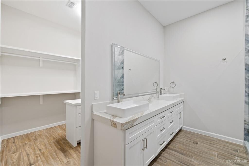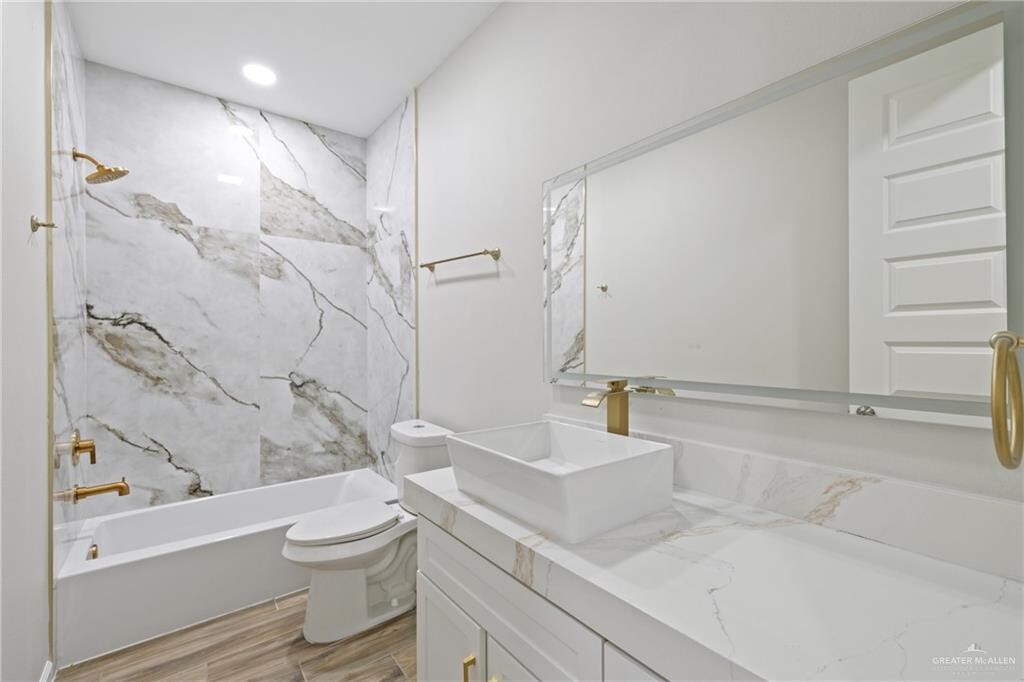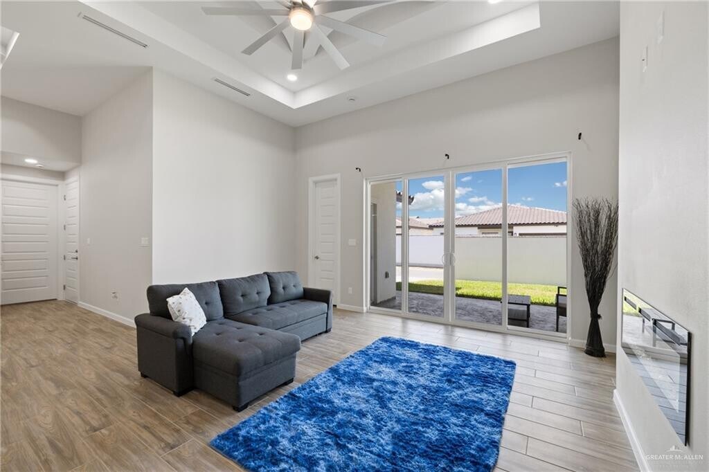 OWNER FINANCE AVAILABLE: 10% down,10% interest,30yr term. No pre payment or balloon loan. Stunning new home in the prestigious Spanish Oaks at La Frontera Subdivision,ideally situated in North McAllen. This move-in ready residence features 4 generously sized bedrooms and 2.5 bathrooms. Enjoy an open-concept layout that seamlessly connects the kitchen and living areas,enhanced by soaring decorative ceilings and an elegant electric fireplace. The home showcases custom windows,a unique front door,and high-end cabinetry topped with a striking waterfall island. Calacatta-style Golden Quartz countertops are featured throughout the kitchen,bathrooms,and laundry room. Designed with exquisite attention to detail,the interior boasts a sophisticated neutral palette accented by sleek black and gold fixtures. Conveniently located just moments from shopping and dining along 10th Street and Trenton. Don’t miss out—schedule your private tour today!