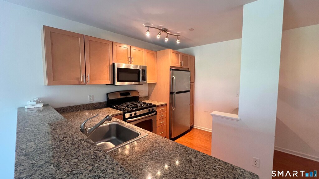 Call for Availability - Do not miss it! Located in the sought-after Quaker Green community, this well-appointed 2-bedroom, 1-bath condo is ideally situated in the Elmwood section of West Hartford. Residents enjoy an impressive array of amenities, including two pools, a fitness center, sauna, billiards room, community room with a kitchen, and pet-friendly living. The kitchen features granite countertops and stainless steel appliances, opening seamlessly to the living room and private balcony, perfect for both everyday living and entertaining. A dedicated dining area and breakfast bar provide ample space for gatherings. The renovated bathroom features a walk-in shower and tile flooring, and the in-unit stackable washer and dryer are conveniently located just outside the bath. The spacious primary bedroom features a walk-in closet and wall-to-wall carpeting, while the second bedroom is also generously sized, with large windows and ample closet space. Additional highlights include separate storage on the first floor, an elevator building with secure entry and an intercom system, abundant guest parking, and assigned parking located directly outside the main entrance. You just need to move in! MLS# 24168193