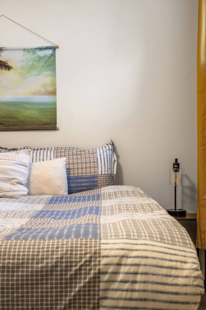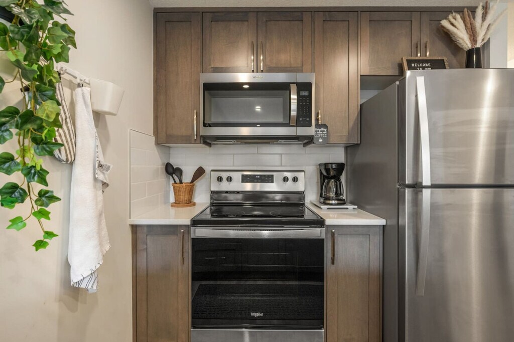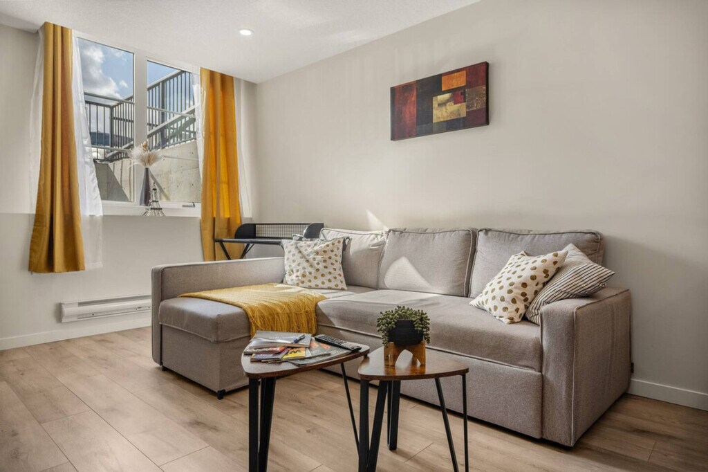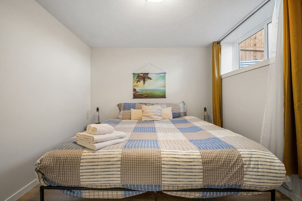 Experience tranquil living in Rocky View with this spacious and scenic apartment, just minutes from the city. Feel at home with a king-size bed and a queen sofa bed, a full bathroom, and a designated parking stall. Enjoy free coffee grinds, tea, and water, along with fast Wi-Fi and a 50” smart TV with Netflix included. The apartment also features heating and a portable AC, as well as an in-unit washer and dryer for your convenience during long-term stays. The apartment boasts a fully stocked and equipped kitchen with stainless steel and custom appliances, including a 4-burner stove, oven, microwave, refrigerator, freezer, and dishwasher with pods provided. Enjoy complimentary paper towels, coffee grinds, tea, and Brita. The living room offers a modern and inviting mood with a large sofa bed, smart TV, and access to a patio. An office desk and chair are also available for your convenience. This pet-friendly apartment welcomes dogs and offers a crib, Pack 'n Play, and high chair for families. Optional upgrades include a national park entry upgrade, welcome basket, birthday decor package, romantic wine and flower package, spa at home package, movie night upgrade, Christmas tree and decor, Halloween decor and pumpkin carving package, winter cozy package, beer tasting kit, diffuser and aroma set, additional bedding and sleeping arrangements, grocery pre-stocking service, and a pet-friendly package. These are subject to availability. Located in Rockland Park, this growing community offers scenic walking paths and green spaces. While some amenities require a short drive, the area is expanding with new shops and services. Enjoy quick access to major highways, making commutes and getaways to Banff, Kananaskis, and Canmore effortless. The apartment is transit-friendly with Calgary Transit bus routes connecting to nearby transit hubs, and it's a bike-friendly area with access to Calgary’s extensive Bow River Pathway system. Check-in and check-out are fully self-service, and a personalized check-in experience is provided. Quiet hours are from 10 pm to 7 am, and there is a strict no-smoking policy with a $250 CAD fine for violations. No parties, drugs, excessive drinking, or loud music are allowed, and noise should be kept under 85db. A noise detector is installed to ensure compliance. Guests are responsible for following city guides on garbage, recycling, and composting, and any infractions may result in fees. Unauthorized late check-out will result in an extra night stay or additional fees. A $200 charge applies for unreturned Banff Pass or unit fob/key. The use of the mailbox is not included, but a PO box can be arranged for a fee. The apartment is professionally managed with 24/7 guest support and local recommendations available. The apartment includes an office and desk station, making it remote work-friendly with fast Wi-Fi and a comfortable set-up for productivity. [SI]