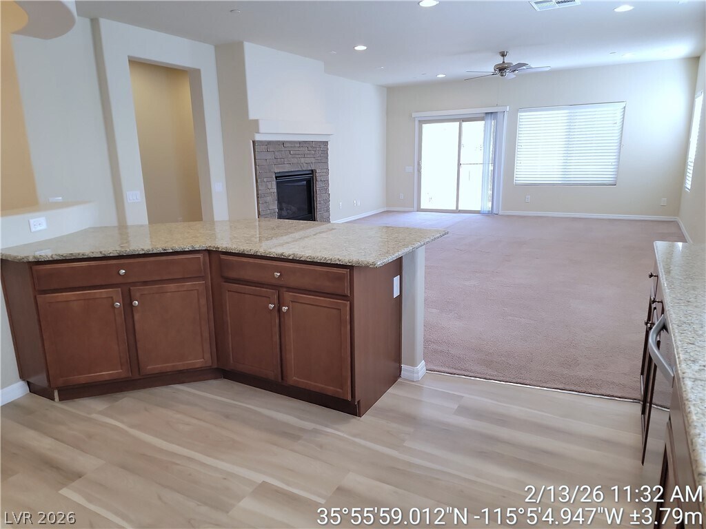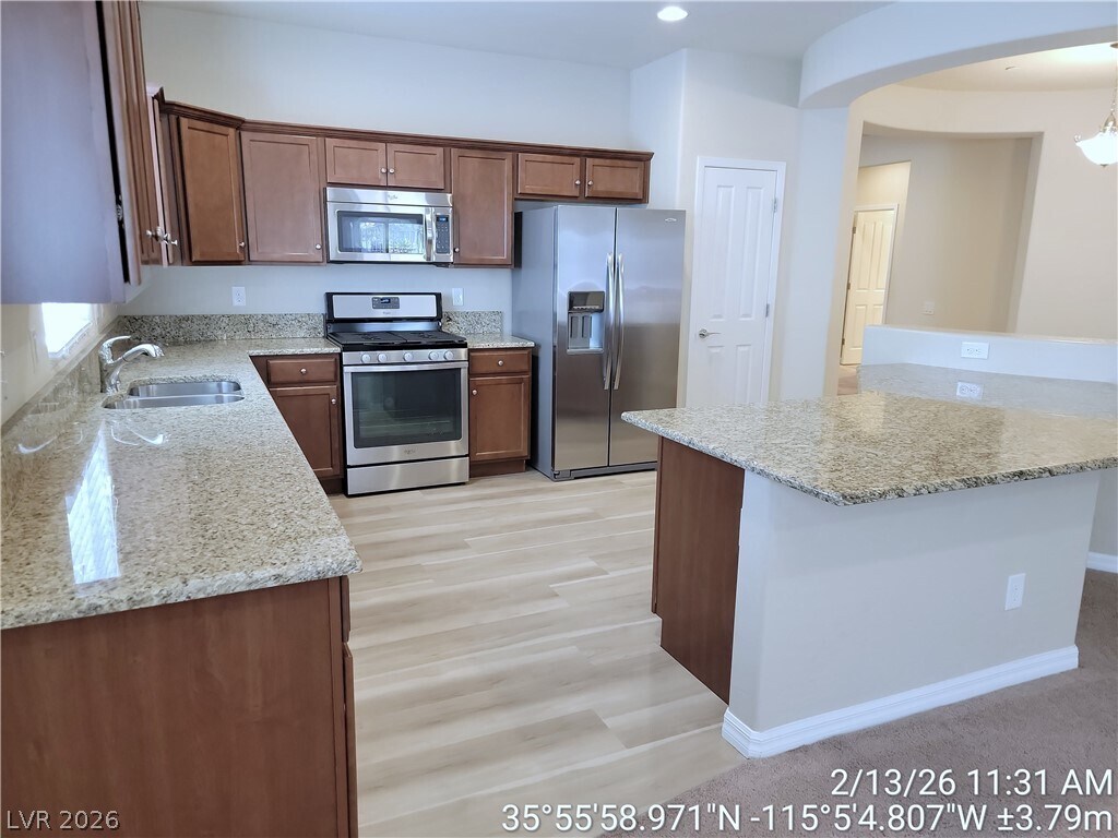 Nestled in the desirable Madeira Canyon community, this beautifully maintained single-story home offers three bedrooms and two bathrooms in a thoughtfully designed open-concept layout. The updated kitchen features a central island, granite countertops, stainless steel appliances, and ample cabinetry, all flowing seamlessly into a spacious living area ideal for relaxing or entertaining. The private primary suite is set apart from the secondary bedrooms and includes dual sinks, a separate tub and shower, and a generous walk-in closet. An additional office or den provides flexible space for working from home or hobbies. Step outside to a low-maintenance backyard with a covered patio and peaceful walking trail views, perfect for enjoying quiet mornings or evening sunsets. Just down the street, you’ll find the highly regarded Madeira Canyon Park, offering recreation and outdoor enjoyment close to home. Small pet considered. Base rent $2058 + $37 RBP.